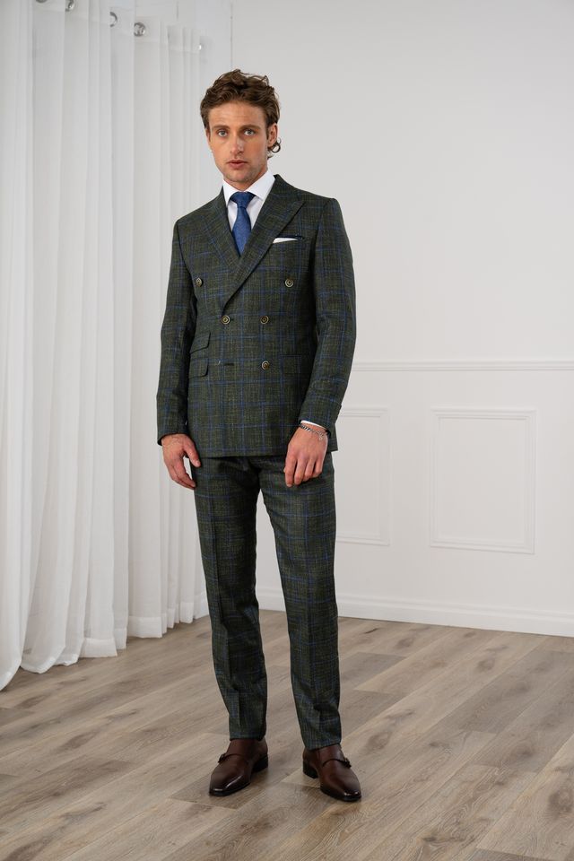 The Aiden 2-Piece Suit is crafted from a premium sharkskin fabric with a subtle check overlay, making it a standout winter tailoring piece. Its refined texture gives the suit depth and dimension, while the peak lapel, formal flap pockets, and ticket pocket introduce sharp, structured detailing. Contrast buttons are intentionally selected to pick up tones within the fabric, adding personality without compromising its sophisticated edge.