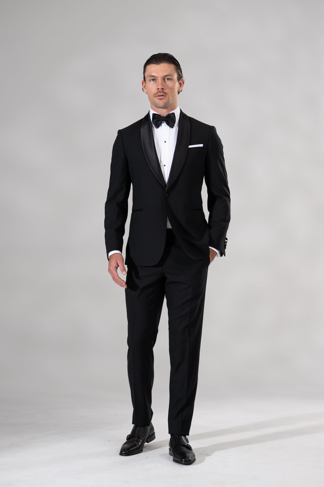 Every element is designed with sophistication in mind — luxurious satin finishes, a textured weave that catches interest up close yet appears smooth from a distance, and exceptional shaping through the chest and shoulders. Minimalistic slit pockets and a refined single-button closure complete the look, creating a tuxedo that effortlessly balances elegance and modern design.