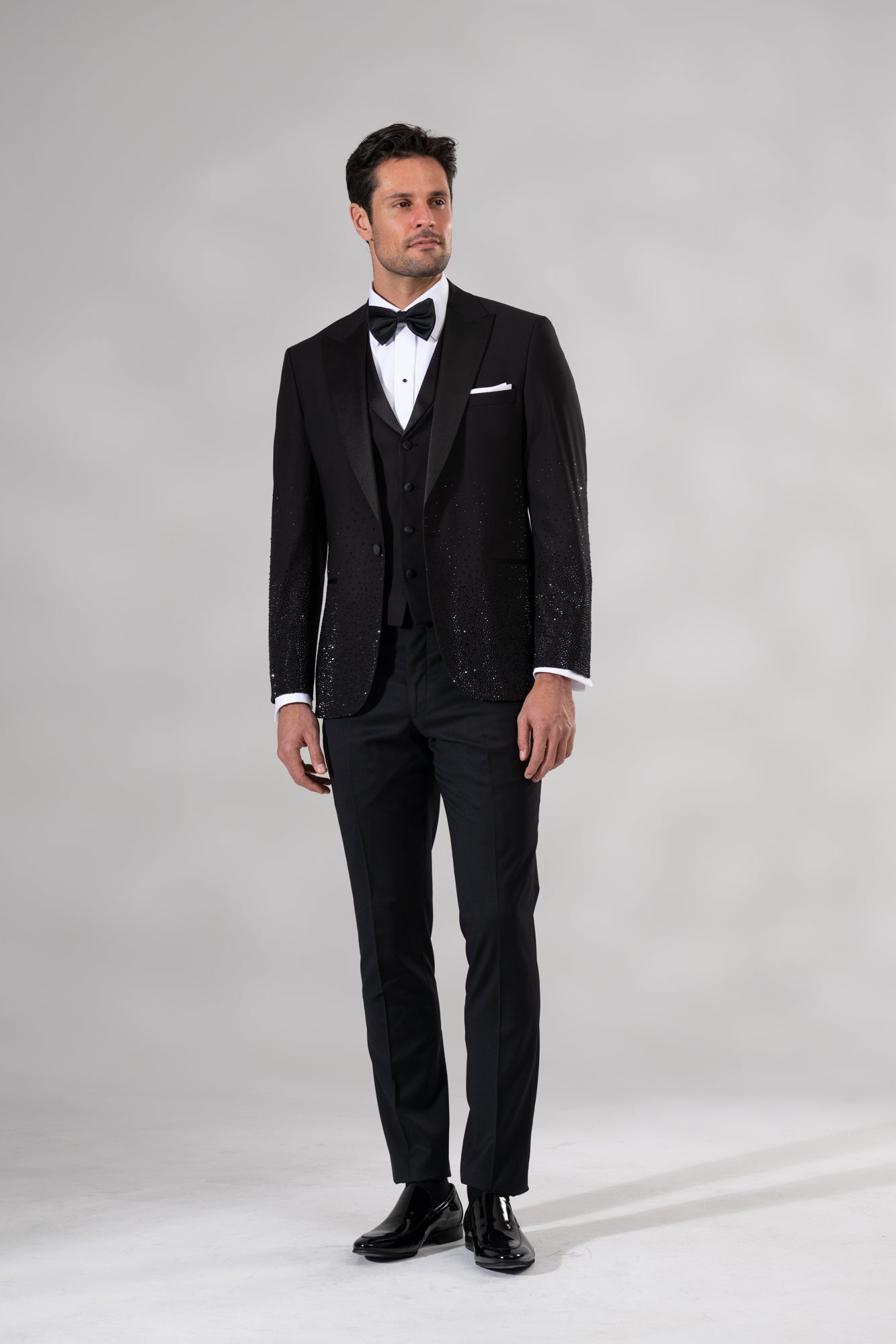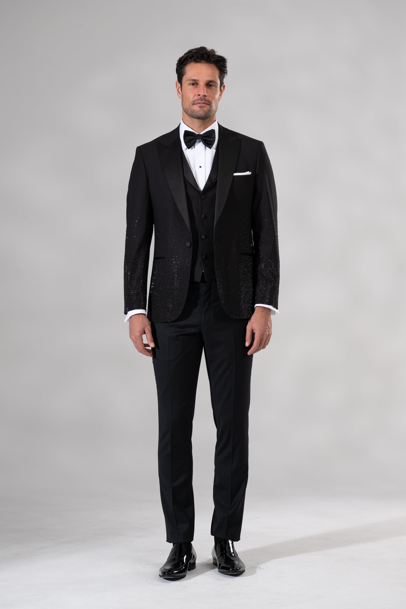 The Amalfi 3-Piece Tuxedo is designed to captivate, combining classic tuxedo elegance with a bold, jewel-studded finish that commands attention. The jacket features a striking gradient embellishment, with gems clustered densely at the hem and gradually dispersing toward the waist to create a shimmering wet-look effect. Crafted on a timeless single-breasted base, it includes a satin-finish peak lapel and minimalistic slit pockets that balance the dramatic detailing.