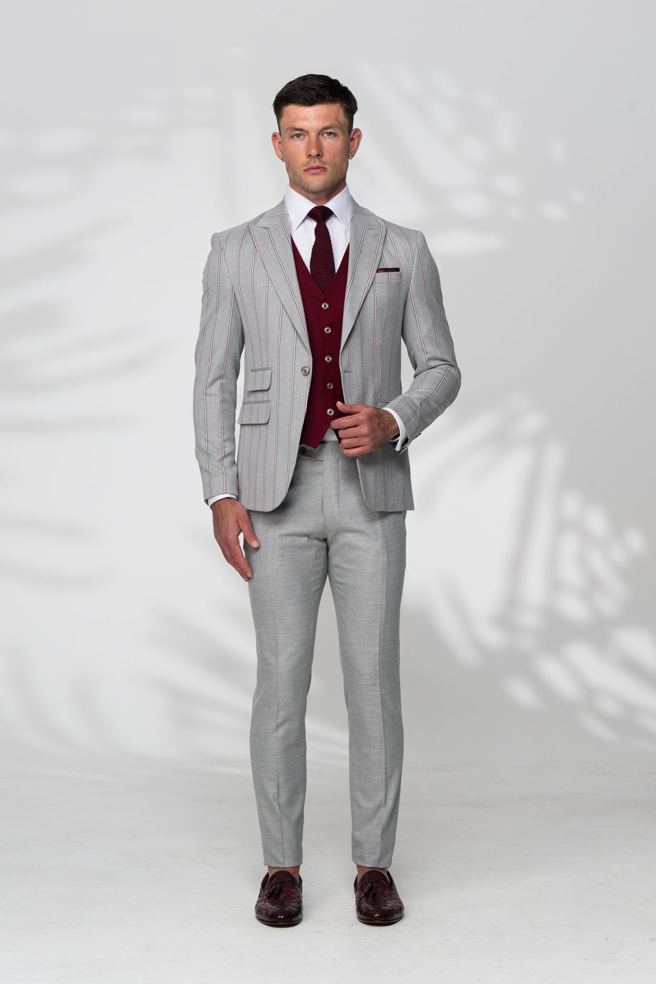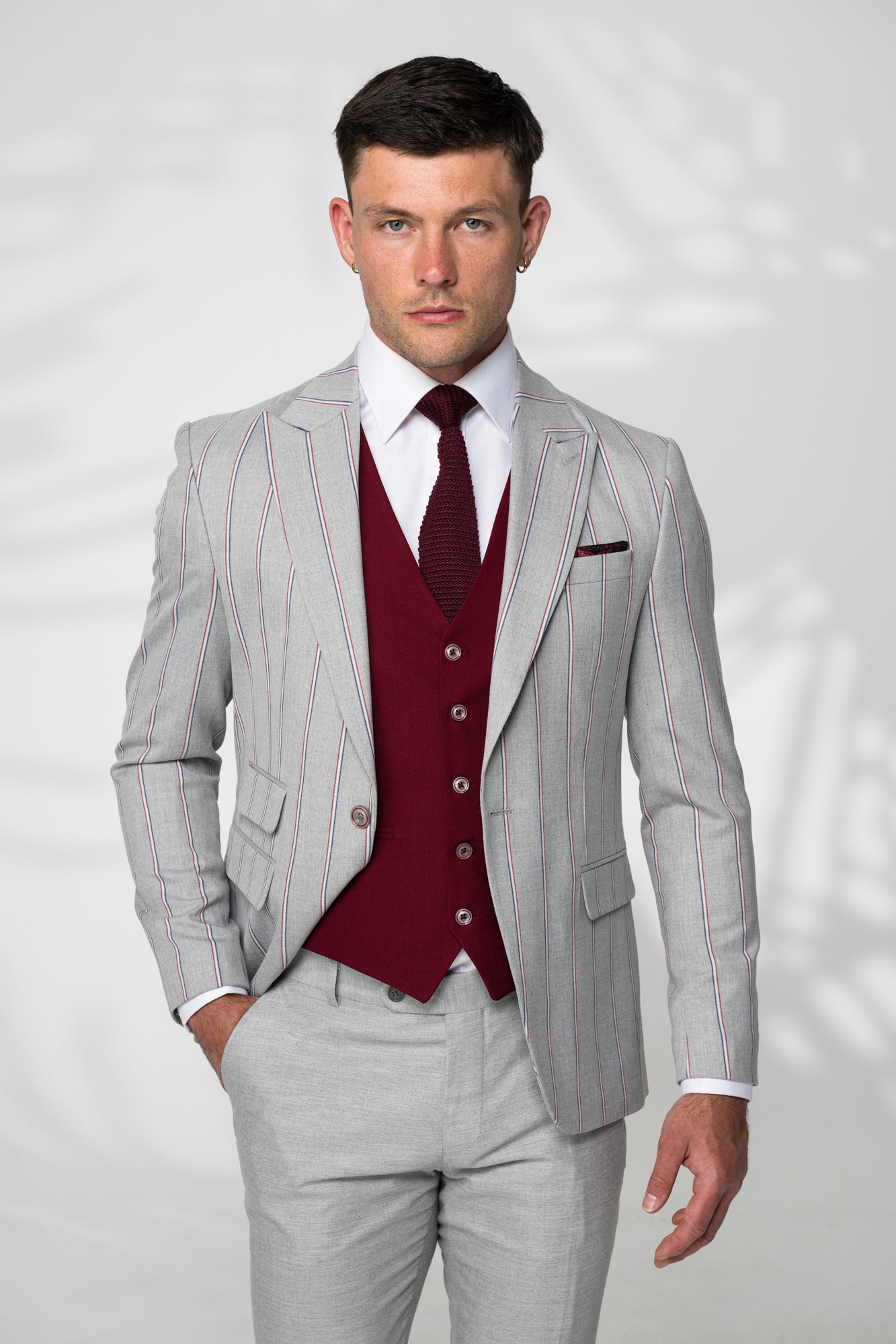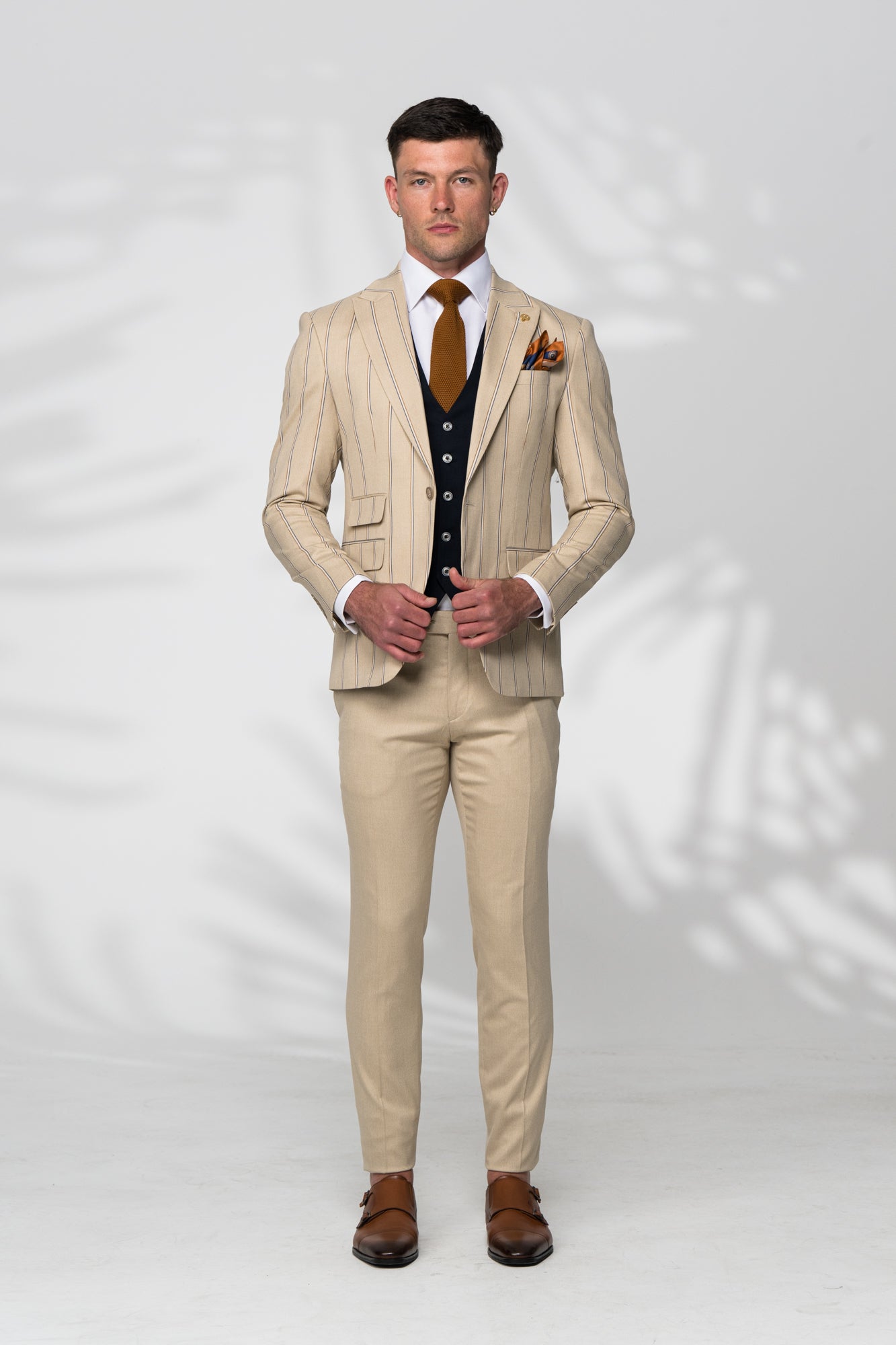 The Angus 3-Piece Suit is a bold, carnival-inspired ensemble designed for those who want to stand out with confidence. The pinstripe jacket takes the spotlight with its commanding peak lapel, flap pockets, and ticket pocket, creating a sharp and elevated silhouette. A contrasting vest adds a vibrant pop of colour, while the trousers match the jacket’s base fabric to keep the look cohesive and intentional.