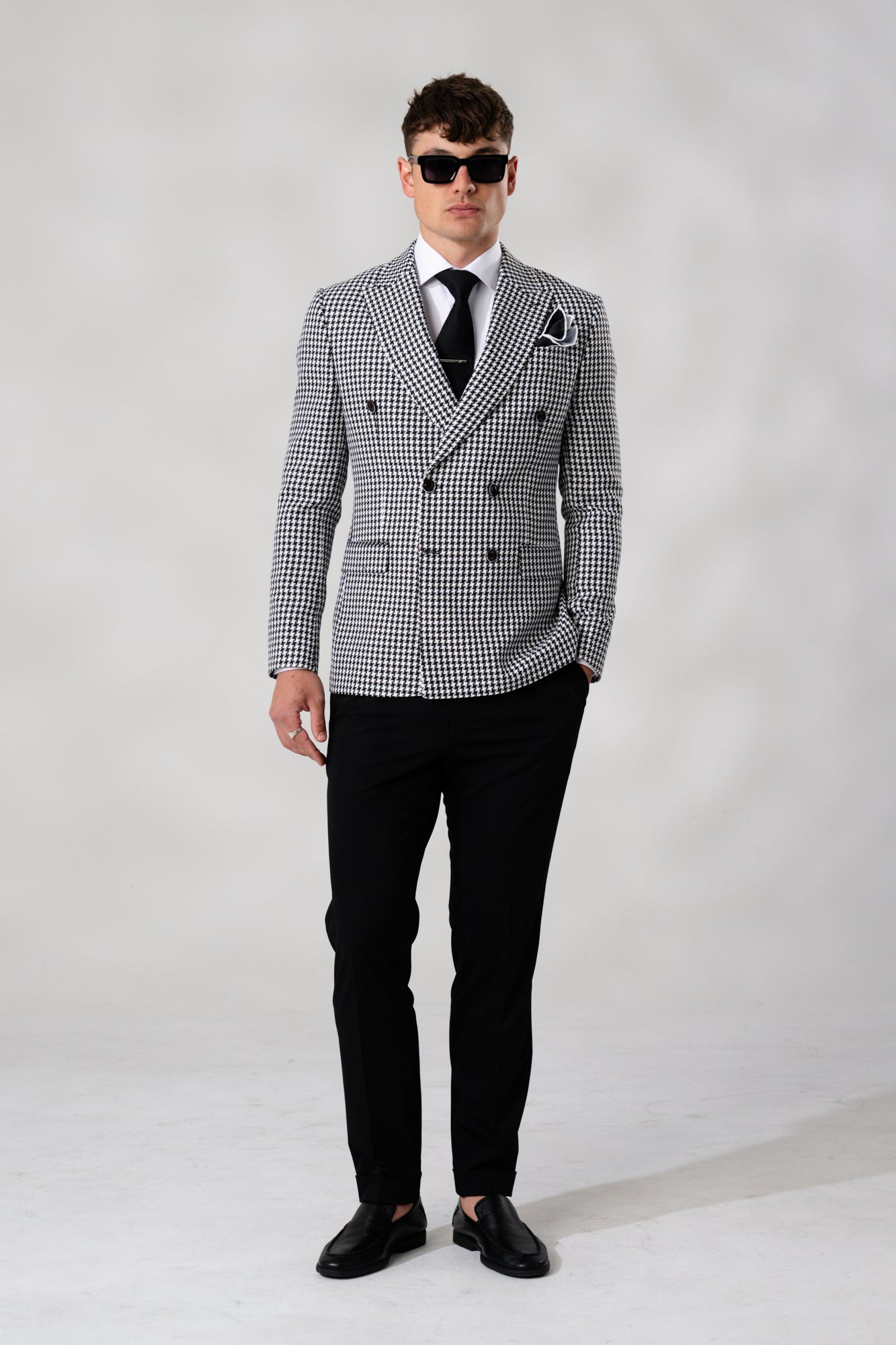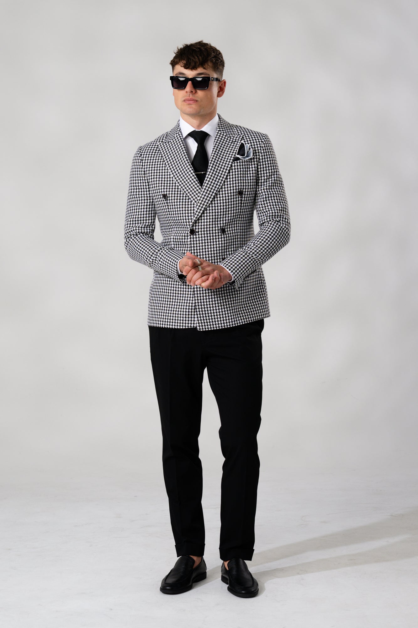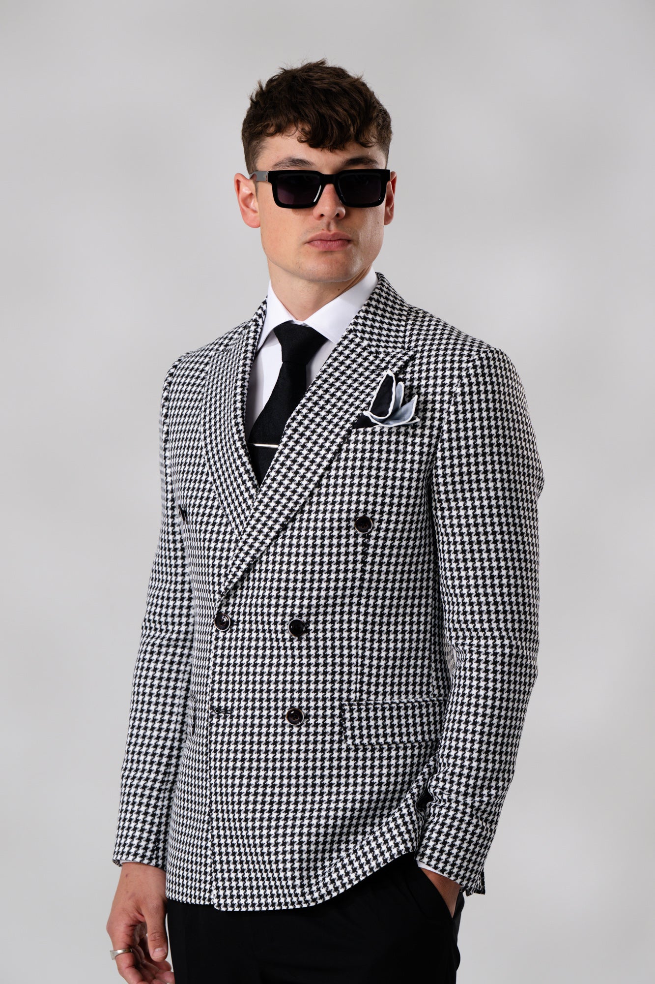 The Apex Houndstooth Jacket brings a modern edge to a timeless pattern. Designed with a classic medium-scale houndstooth weave, this double-breasted silhouette blends vintage charm with contemporary tailoring. The open-weave texture complements the pattern, giving the jacket depth, breathability, and a refined, tactile feel. Finished with a sharp peak lapel, flap pockets, and bold statement buttons, the Apex jacket delivers a confident, polished look — perfect for elevating smart-casual outfits or creating a standout moment at your next event.