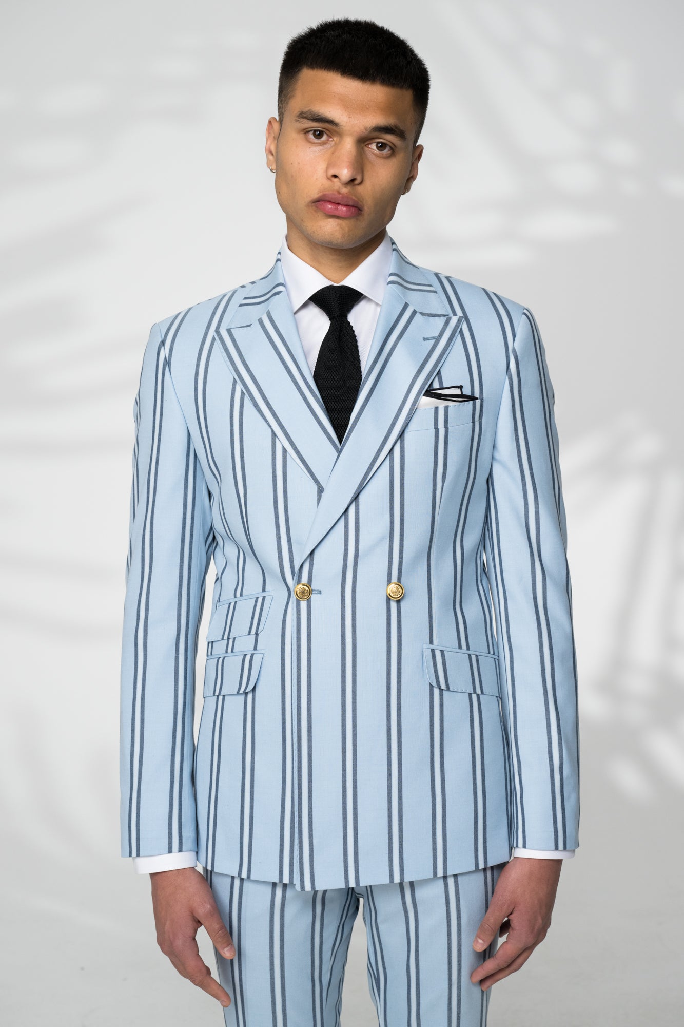 The Atticus 2-Piece Suit is a true showstopper, crafted for those who appreciate bold, fashion-forward tailoring. Its unique light blue base fabric is accented with white and navy pinstripes, creating a striking visual contrast that feels both modern and refined. The 2-button double-breasted silhouette is complemented by a sharp peak lapel, flap pockets, ticket pocket, and intricate pick-stitch detailing throughout.