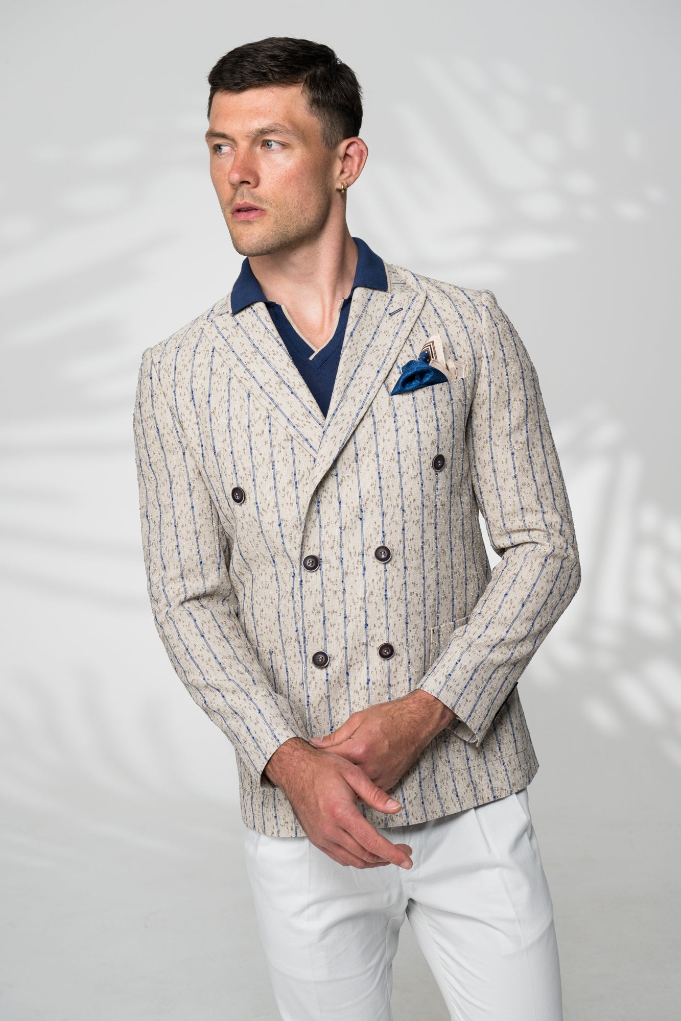 The Benjamin Jacket blends classic tailoring with a refined old-money aesthetic, delivering a versatile piece that elevates any smart-casual or semi-formal look. Crafted in a textured beige fabric with a navy pinstripe, this double-breasted blazer offers depth, contrast, and understated sophistication.