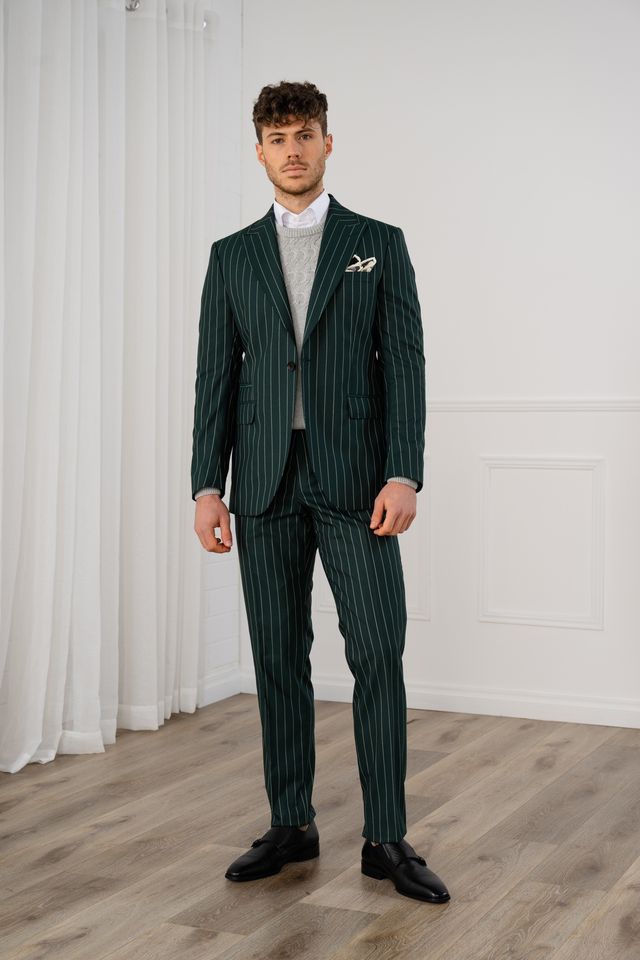 The Clyde 2-Piece Suit is a statement in power and precision. Crafted from pure wool, this striking pinstripe ensemble features bold, wide-set stripes that command attention while maintaining a timeless sense of sophistication. Cut in a sleek single-breasted silhouette with a one-button closure, the suit is elevated by a wide peak lapel, flap and slit ticket pockets, and subtle pick-stitch detailing. Confident, versatile, and undeniably sharp — this is modern tailoring with classic authority.