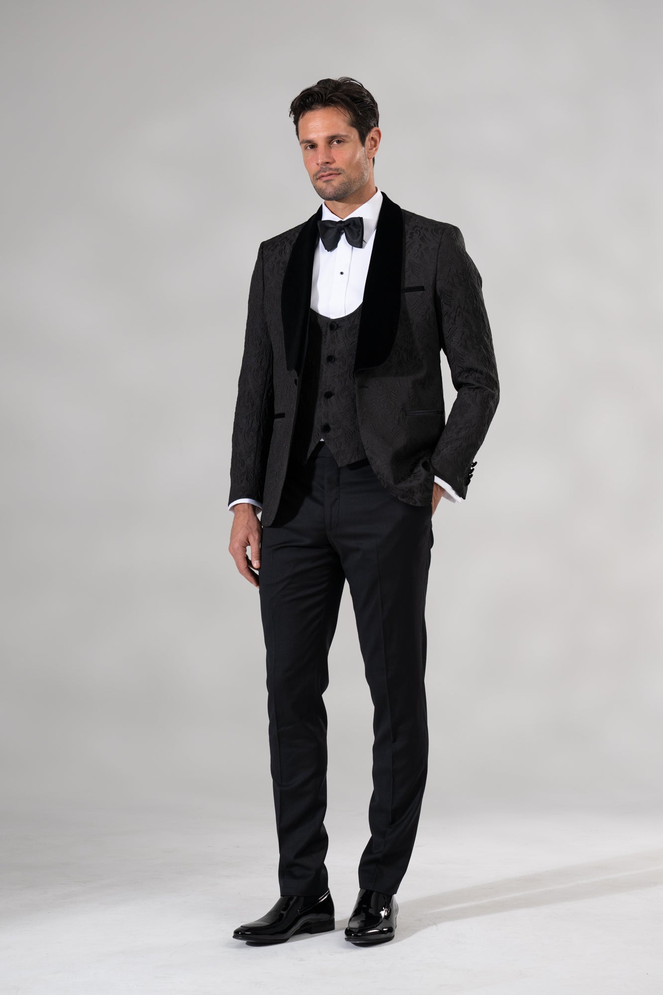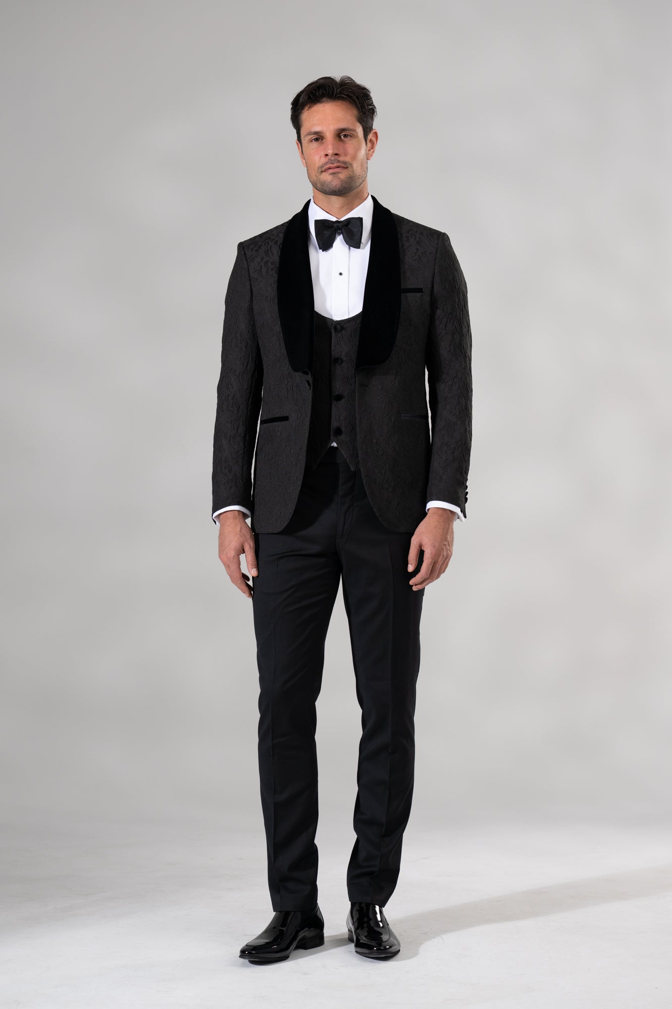 - Textured 3-piece tuxedo with deep velvet shawl lapel