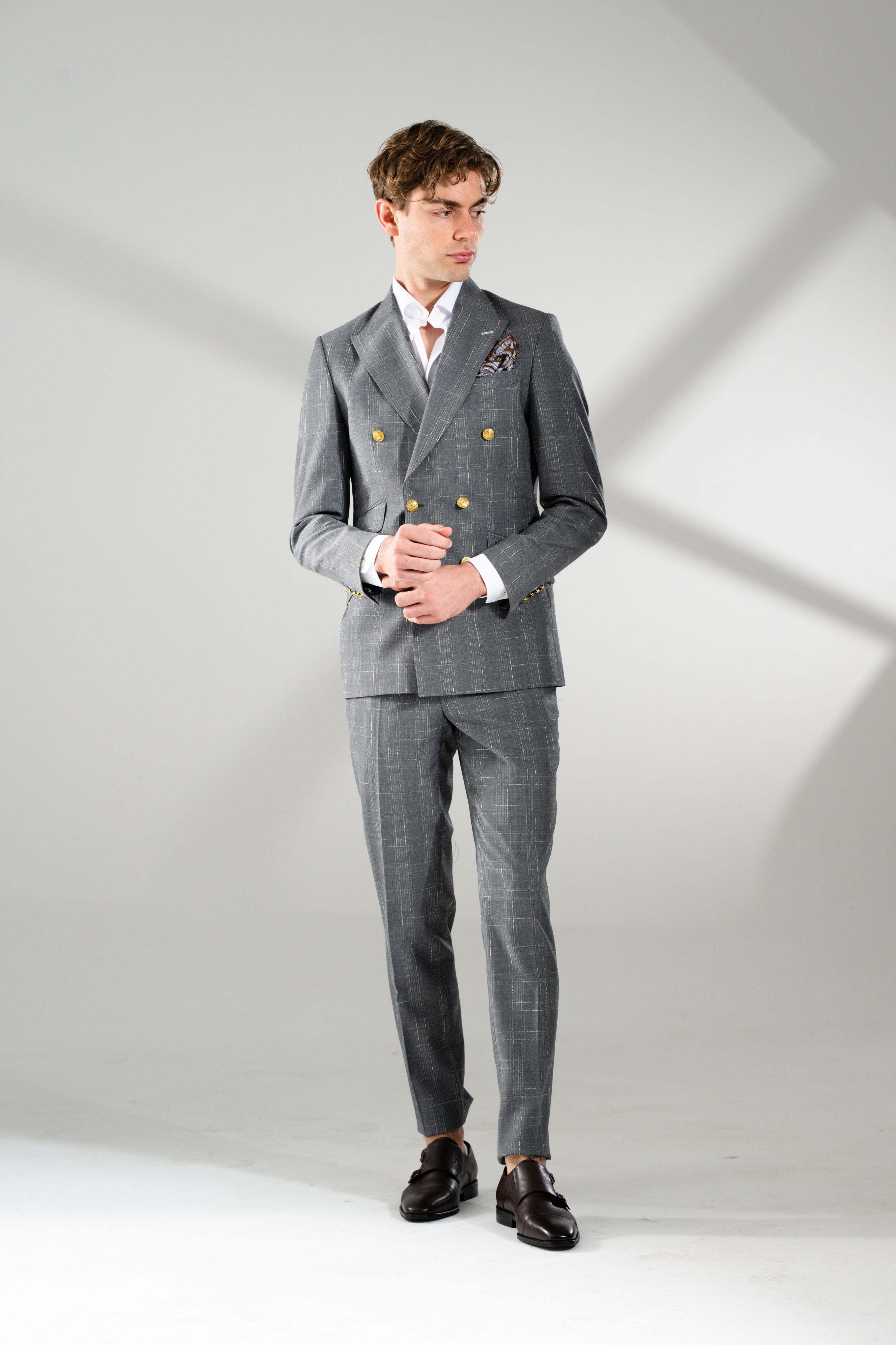 Classic meets statement style in the Daniel 2-Piece Suit. Featuring a refined Prince of Wales chalk check, this grey number is elevated with gold statement buttons, a double-breasted cut, and peak lapels that exude confidence and class. Ticket pockets complete the look, offering timeless British-inspired detailing that sets it apart from the ordinary grey suit.
