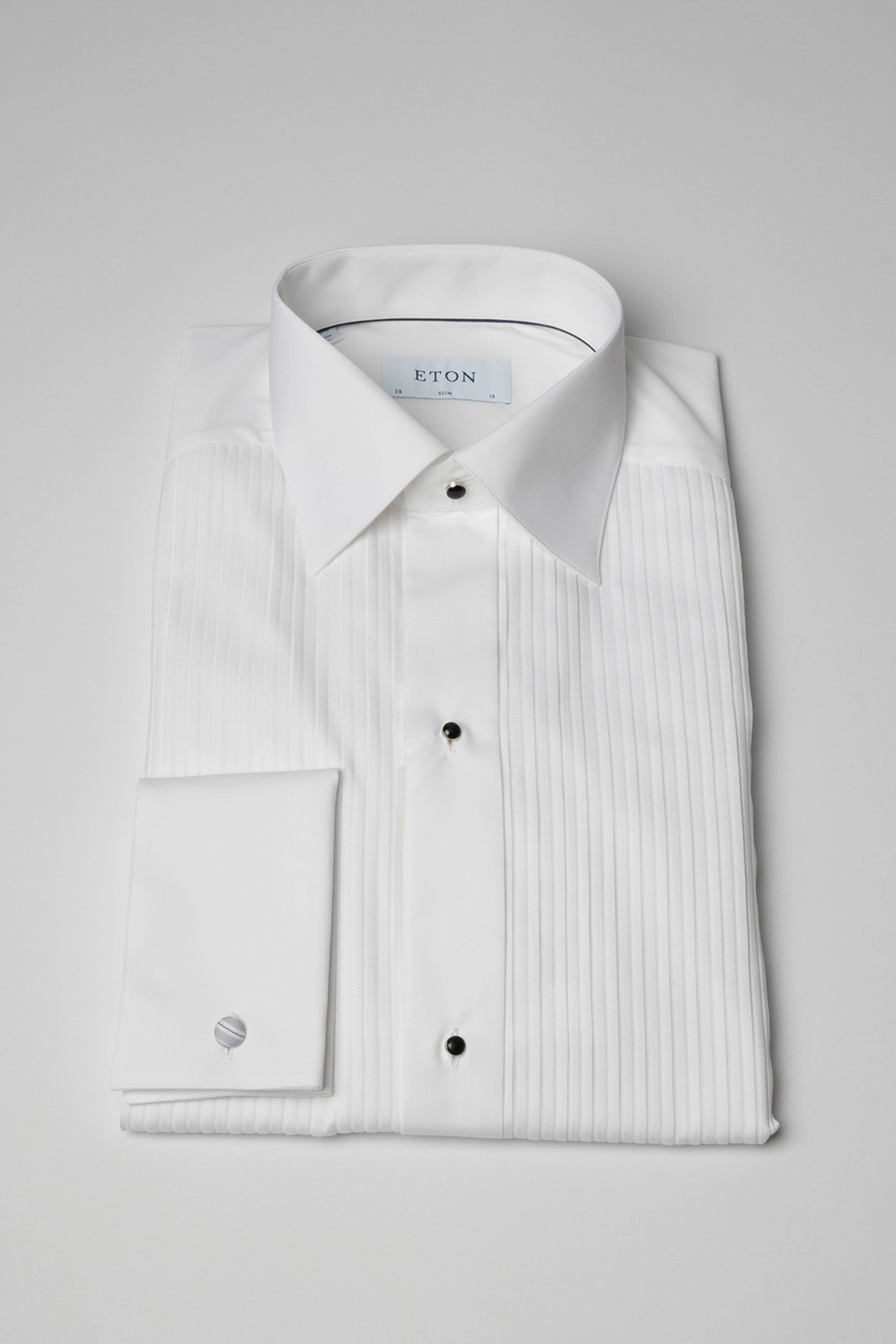 A premium formal shirt featuring a pleated plissé bib, French cuffs and black metal stud buttons. Sharp, refined and designed to hold presence even when the jacket comes off, making it a favourite for grooms and black tie events.