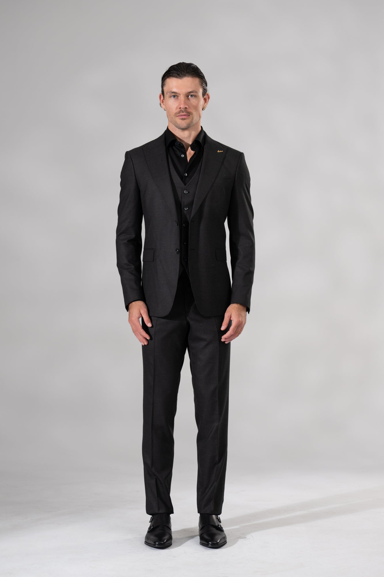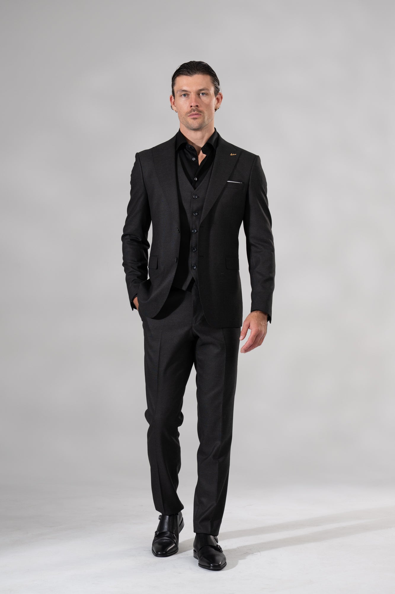 Classic tailoring with a touch of texture. The Hurley 3-Piece redefines timeless dressing through subtle detailing — featuring a delicate fleck woven into the base fabric that catches the light just enough to stand out without shouting for attention. Designed with Dyonsu’s signature wide peak lapel, flap pockets, and a single-button closure, this suit brings balance between tradition and modern refinement. The single-breasted vest mirrors the same clean lines, while matching trousers complete the set for a unified and polished finish. A suit for the understated modern man — confident, effortless, and quietly distinctive.