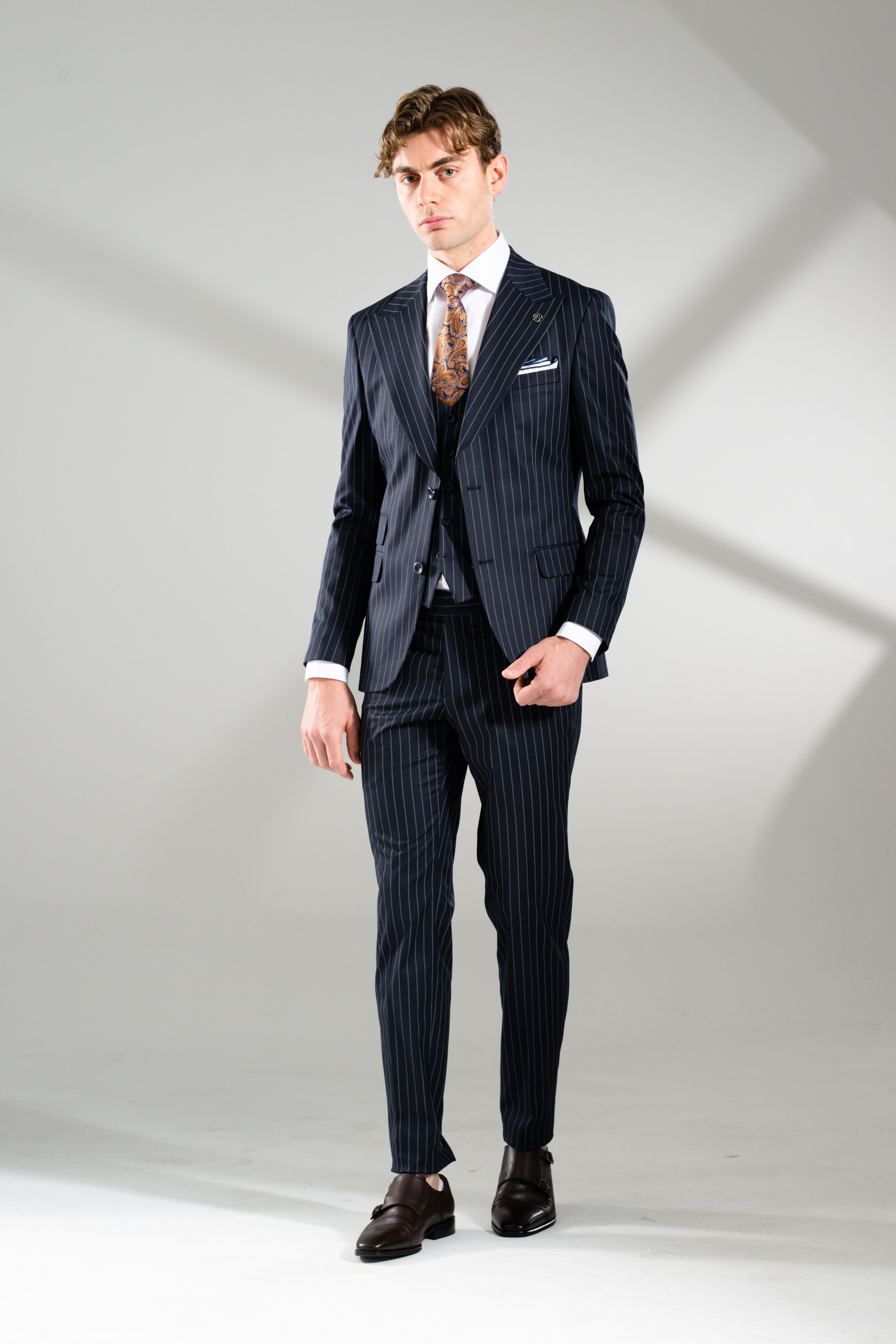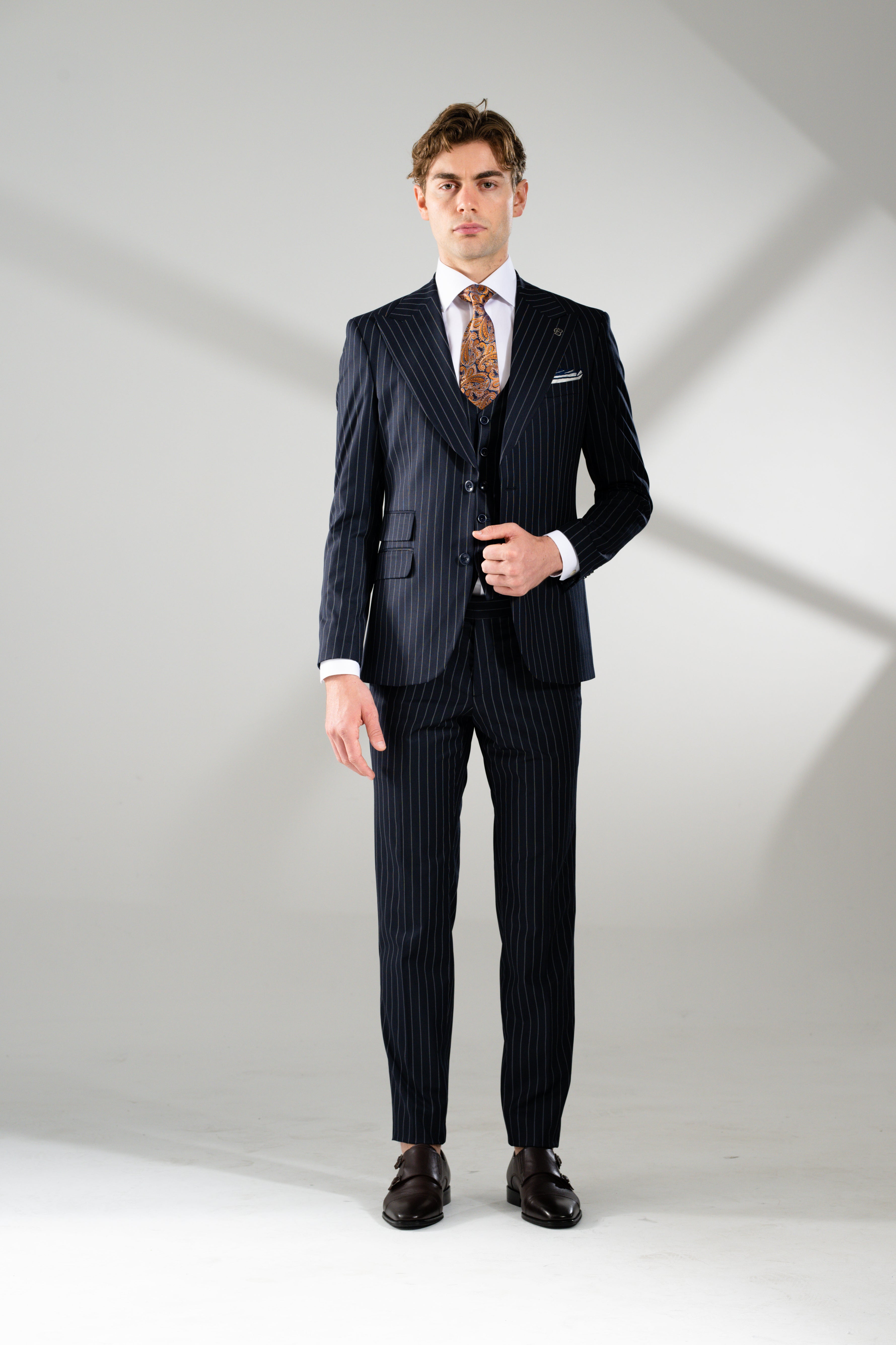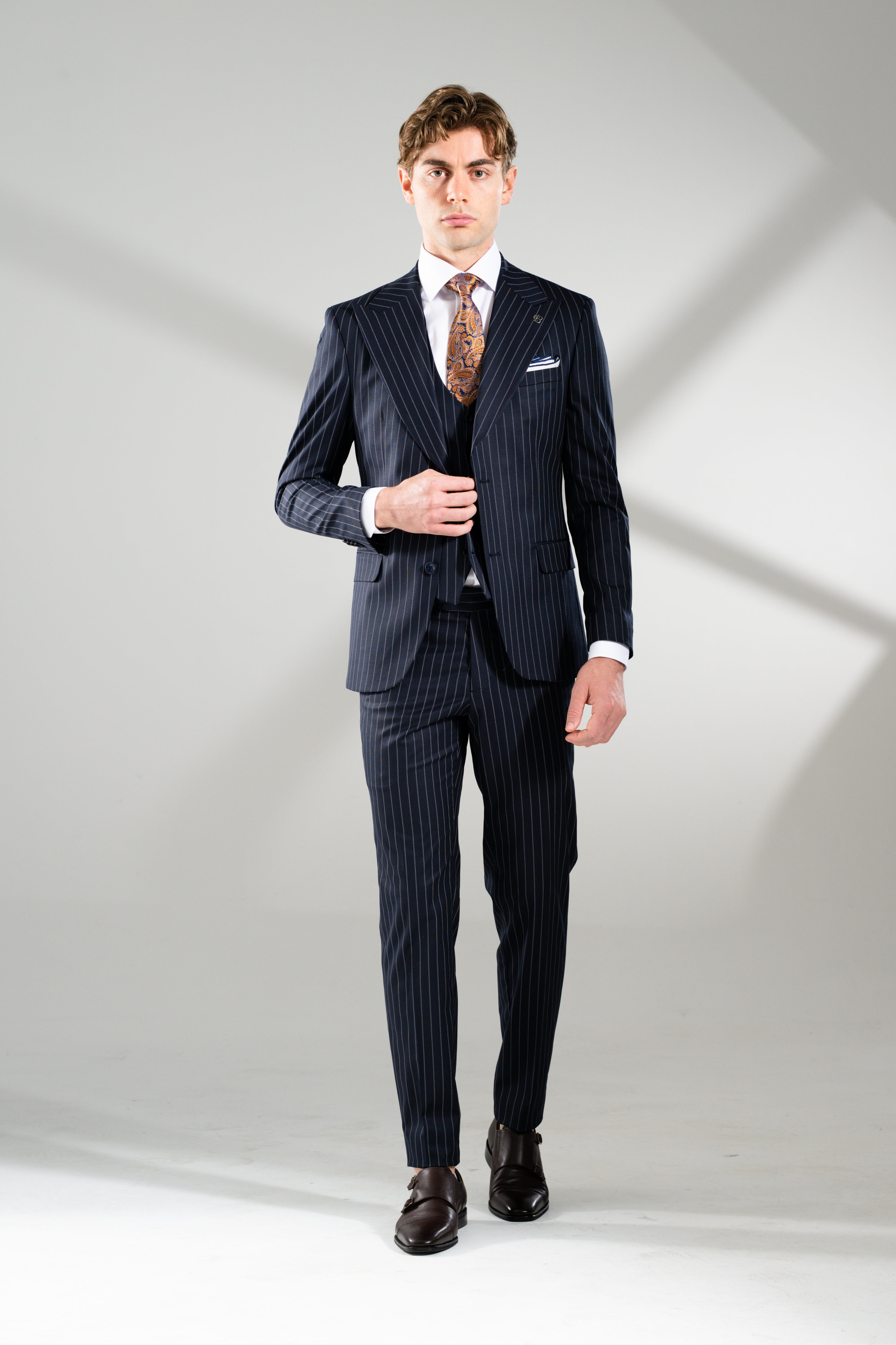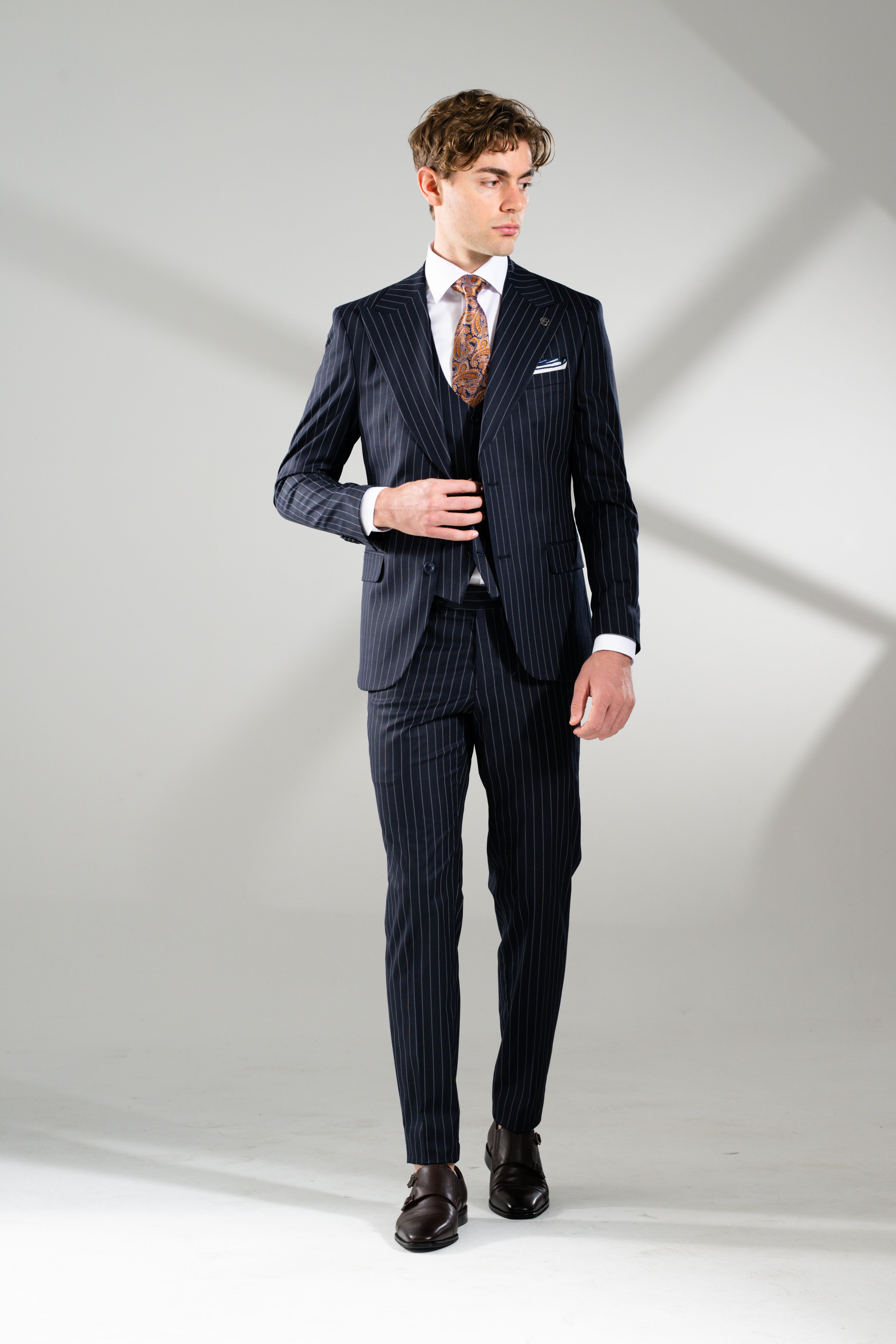A timeless staple reimagined with Italian-inspired sophistication. The Jacob 3-Piece Suit celebrates heritage tailoring with a modern edge — featuring a subtle double chalk-stripe pattern on rich navy fabric. Designed with a wide peak lapel, flap and ticket pockets, and a single-breasted vest with a full fabric back for a sharp silhouette from every angle. Matching trousers complete the look, detailed with a horizontal waistband stripe for subtle contrast and elevated refinement. Classic. Confident. Endlessly versatile.