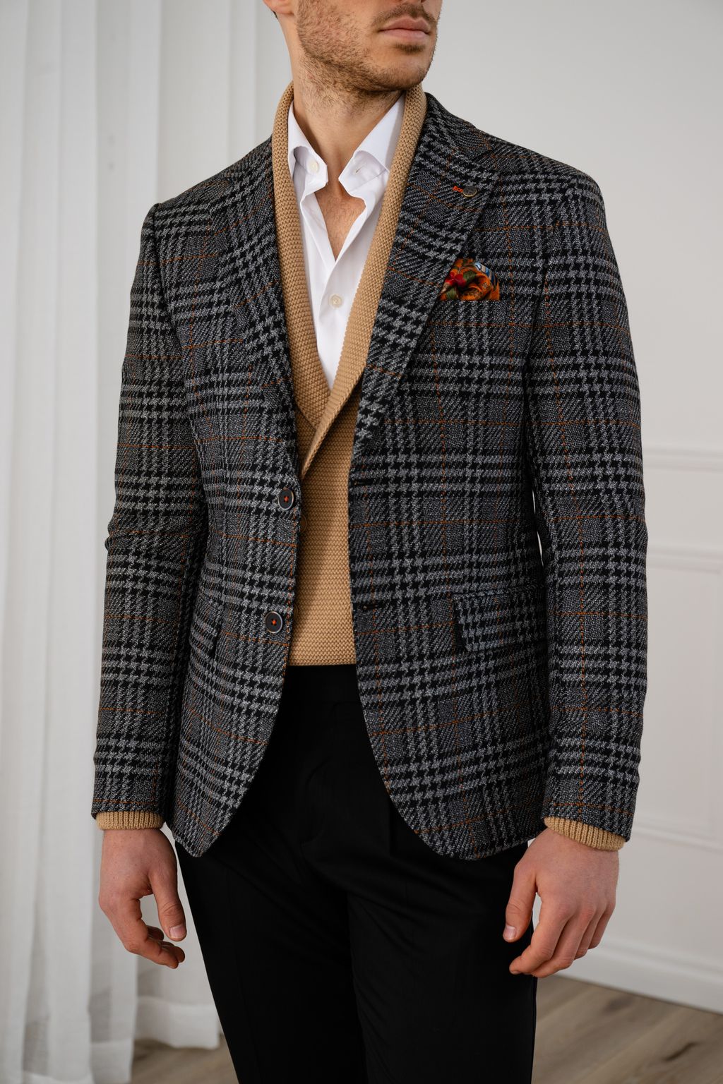 The Bradley Jacket is a refined casual blazer crafted for the cooler months, combining warmth, texture, and timeless patterning. Designed in a classic Prince of Wales check with a subtle houndstooth overlap, it delivers depth and sophistication in every detail. The wide step lapel, complementary buttons, and flap pockets enhance its traditional charm while maintaining a modern, versatile feel.