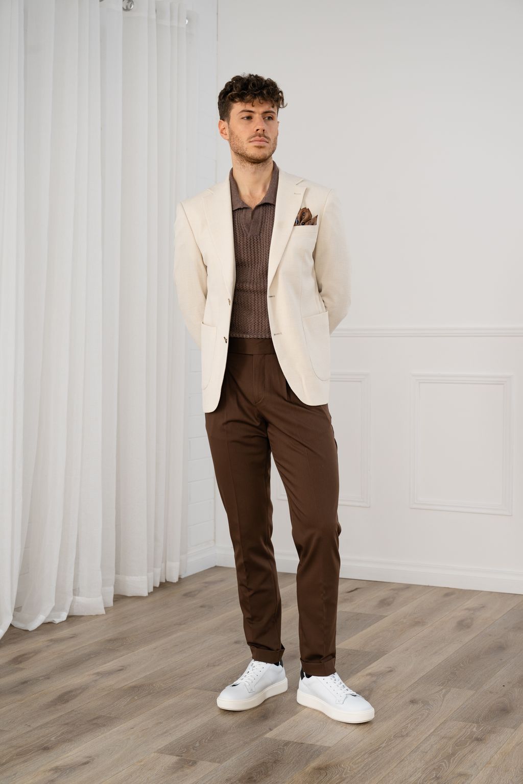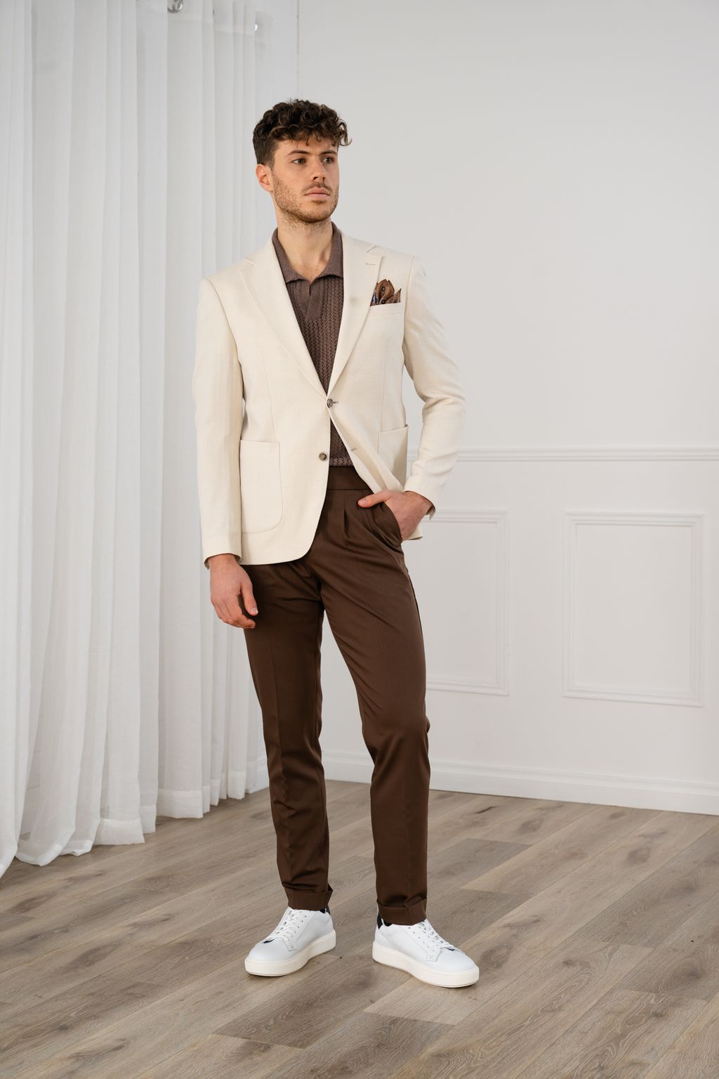Effortlessly refined, the Jordan Jacket brings subtle texture and modern comfort to your casual rotation. Crafted from a soft herringbone weave with just the right amount of stretch, it delivers both structure and ease. Designed with a single-breasted cut, wide step lapel, contrast buttons, and patch pockets — this piece is perfect for layering over knits or shirts when the occasion calls for smart yet relaxed sophistication.