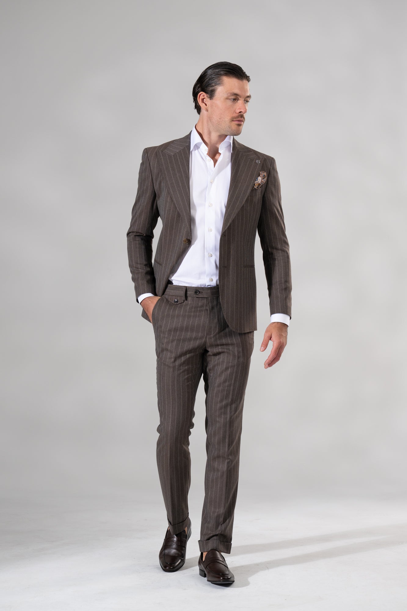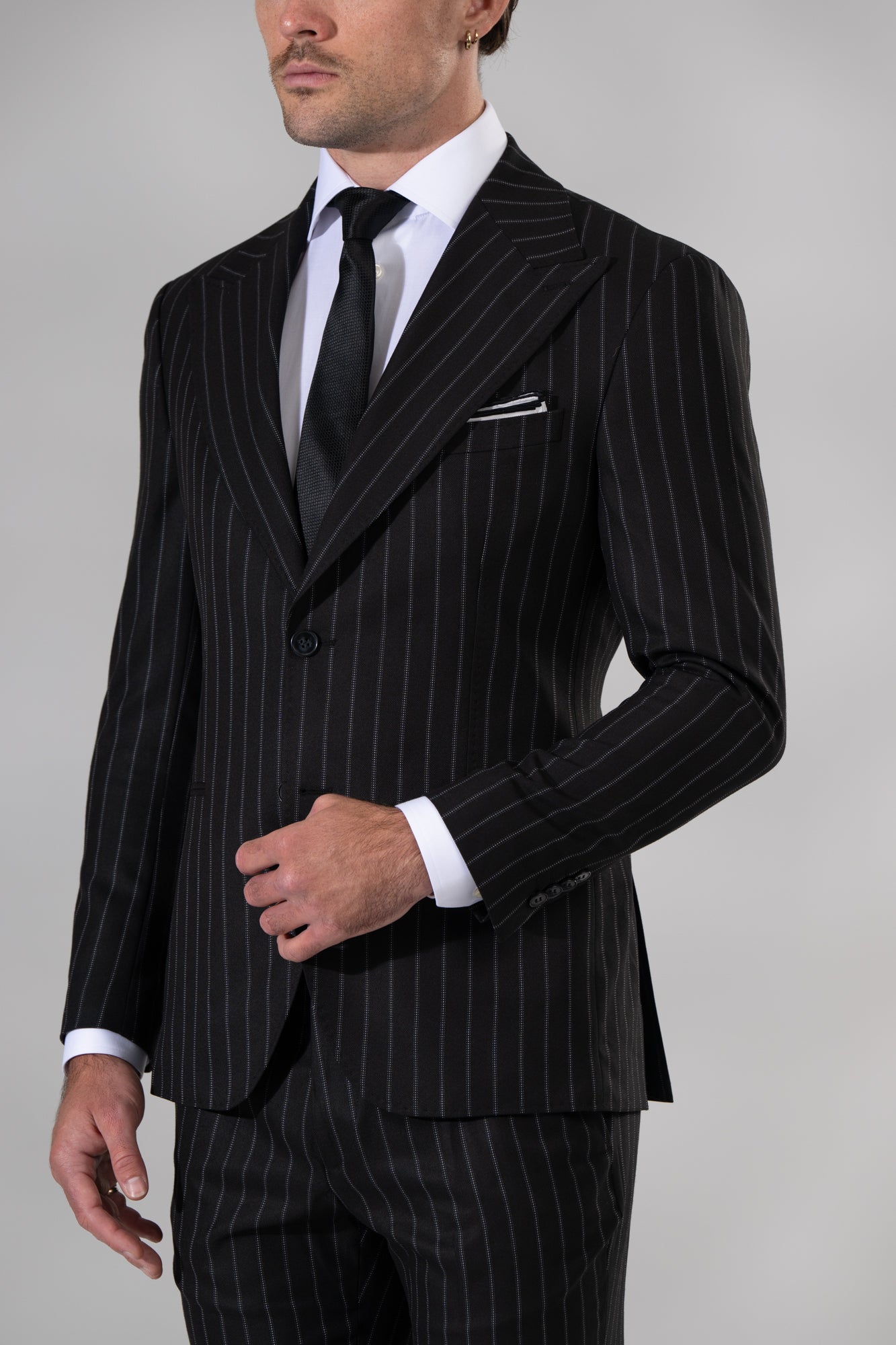 Make a statement without saying a word. The Lennox is a bold take on the classic pinstripe — a wider-set stripe pattern that commands attention while keeping things timeless. Crafted from a soft wool blend with stretch for comfort, this single-breasted two-button design features a wide peak lapel, slit pockets, and subtle pick-stitch detailing. A suit that bridges power dressing with modern ease — sharp enough for business, confident enough for play.