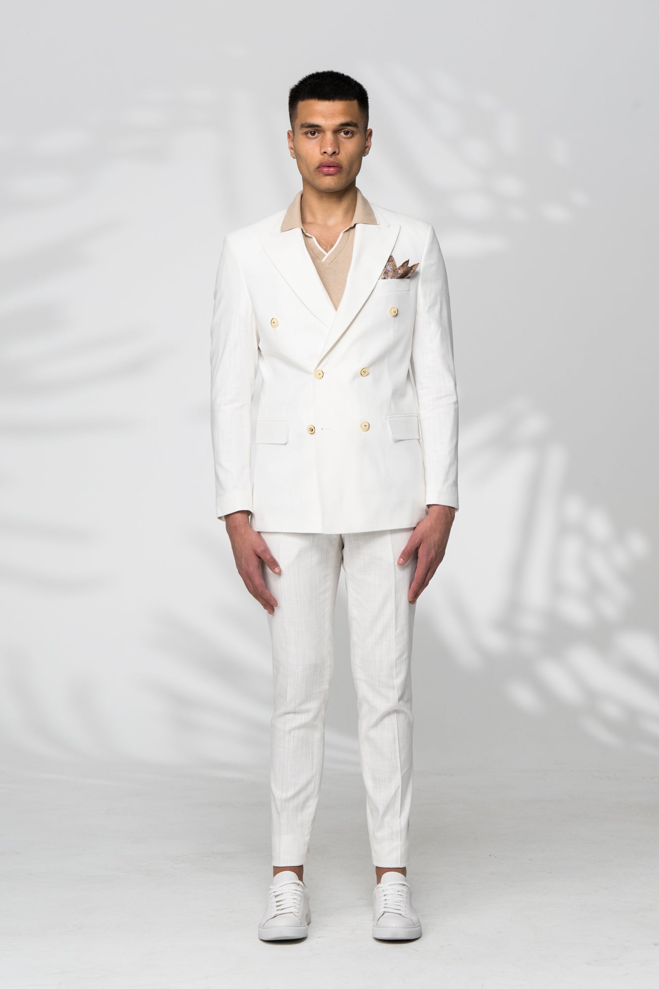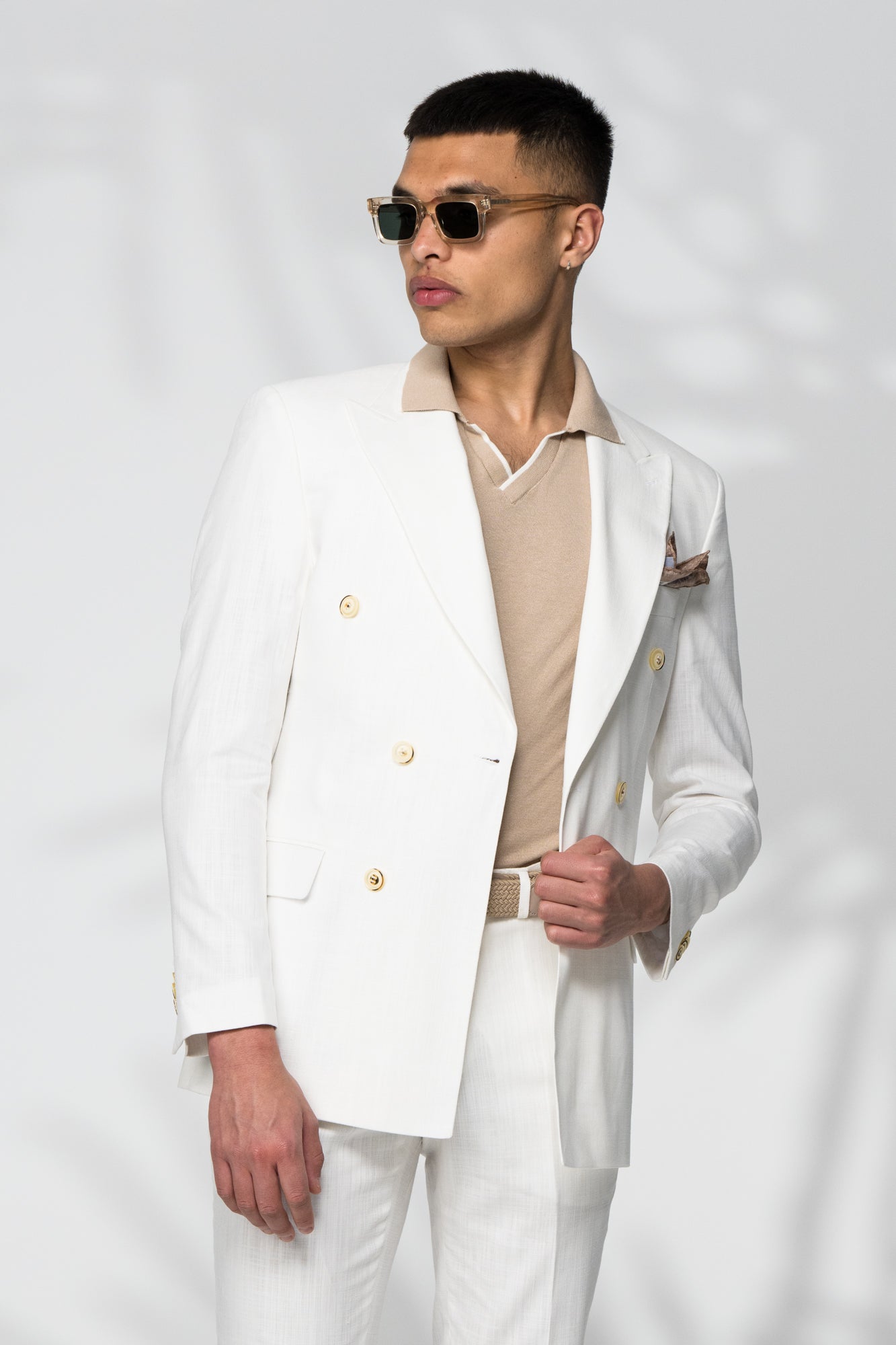 Breezy sophistication for the warmer months — the Lincoln suit is designed for summer living without sacrificing style. Cut from a breathable linen–cotton blend, this double-breasted suit keeps you cool and comfortable even in high temperatures. Featuring a structured Italian silhouette with a wide peak lapel, contrast buttons, and flap pockets, it’s the ultimate warm-weather ensemble for refined dressing. From daytime celebrations to evening soirees, the Lincoln ensures you’ll always look sharp under the sun.
