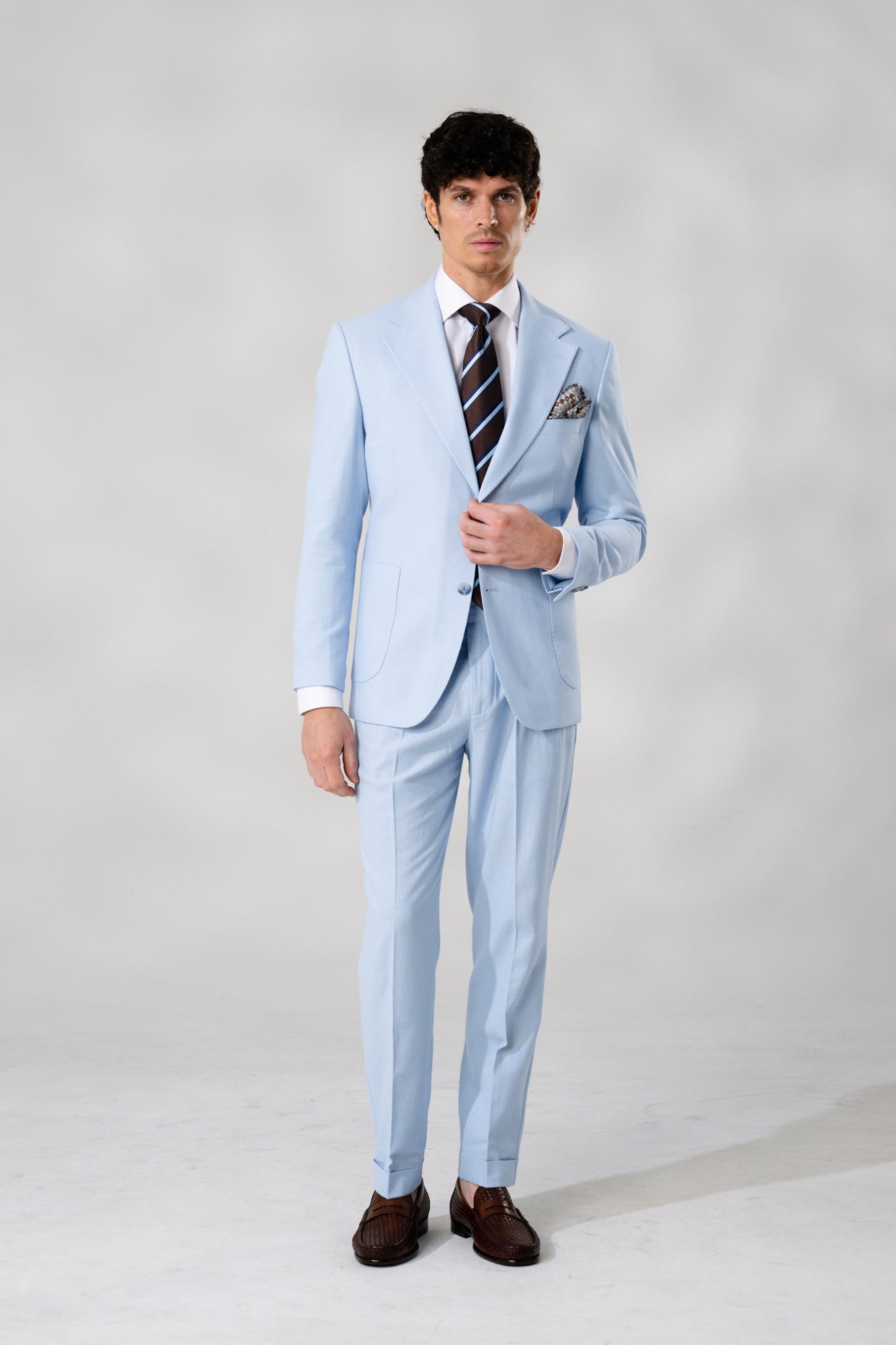 Relaxed tailoring at its finest — the Lucca Suit is where laid-back luxury meets sharp design. Crafted from a soft linen–cotton blend, this single-breasted suit features a step lapel, patch pockets, pick-stitch detailing and tortoiseshell buttons for a refined yet easygoing finish. Wing-lined for breathability, it’s built for comfort without compromise. The trousers are where the magic happens — high-waisted with a wide waistband, double front pleats, side adjusters, and a cuffed finish. Structured but relaxed, they’re as elegant as they are effortless. Perfect for summer weddings, coastal events, or anytime you want to make “casual” look considered.