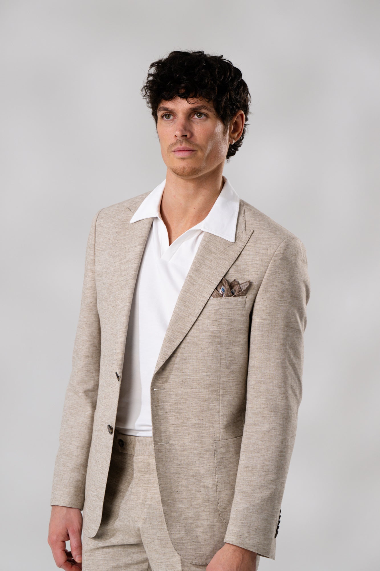 Casual refinement meets effortless sophistication — the Minos Suit delivers the relaxed feel of linen with the smooth finish of sharkskin weave. Lightweight yet structured, this 2-piece is designed for versatility and comfort. Featuring a peak lapel, contrast buttons, pick stitching, and patch pockets, its wing-lined jacket and cuffed pant offer easy wear and all-day polish. The unique linen-like texture keeps things soft while resisting creases, making Minos the perfect warm-weather companion for events, parties, or a standout day in the sun.
