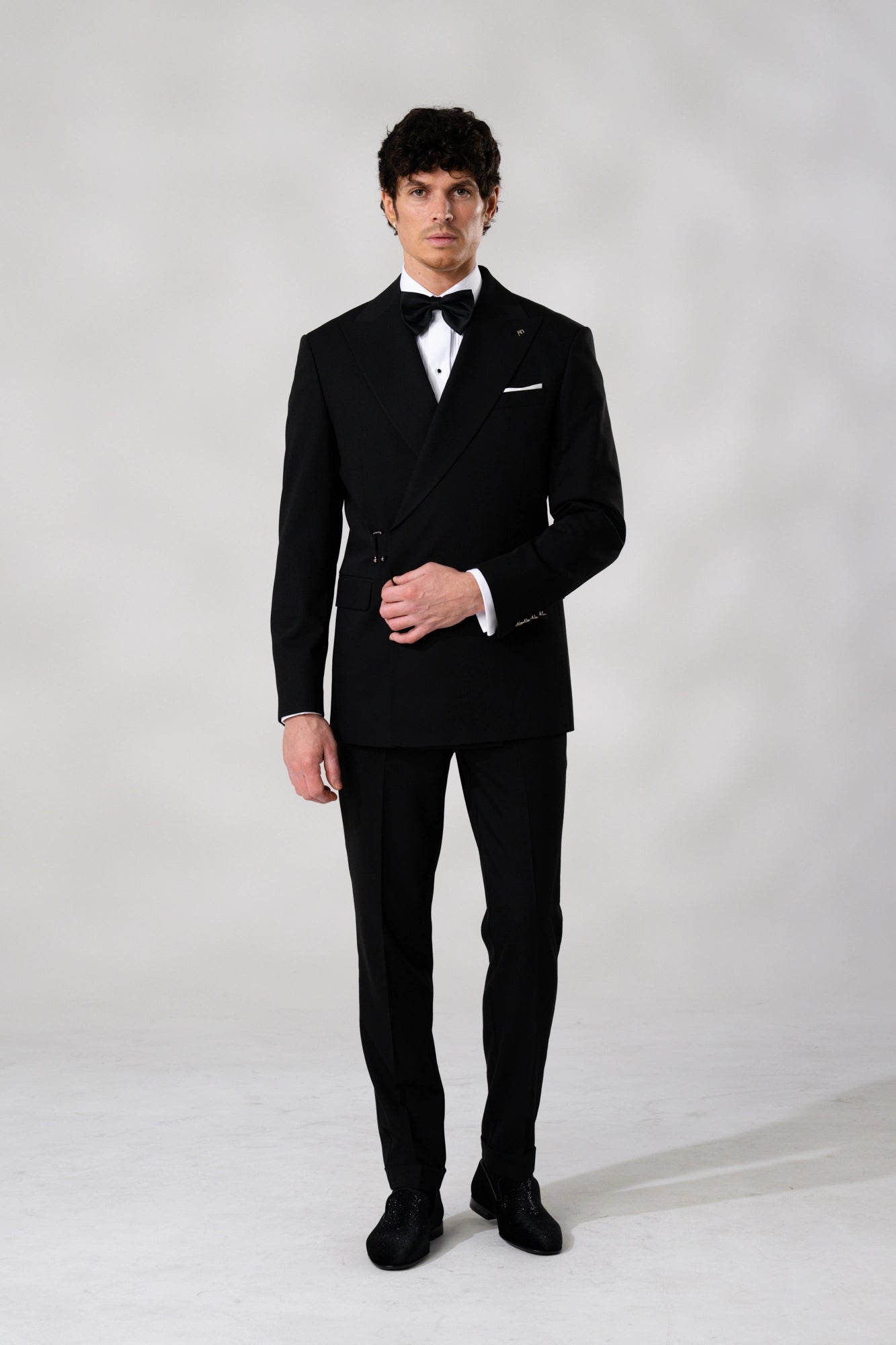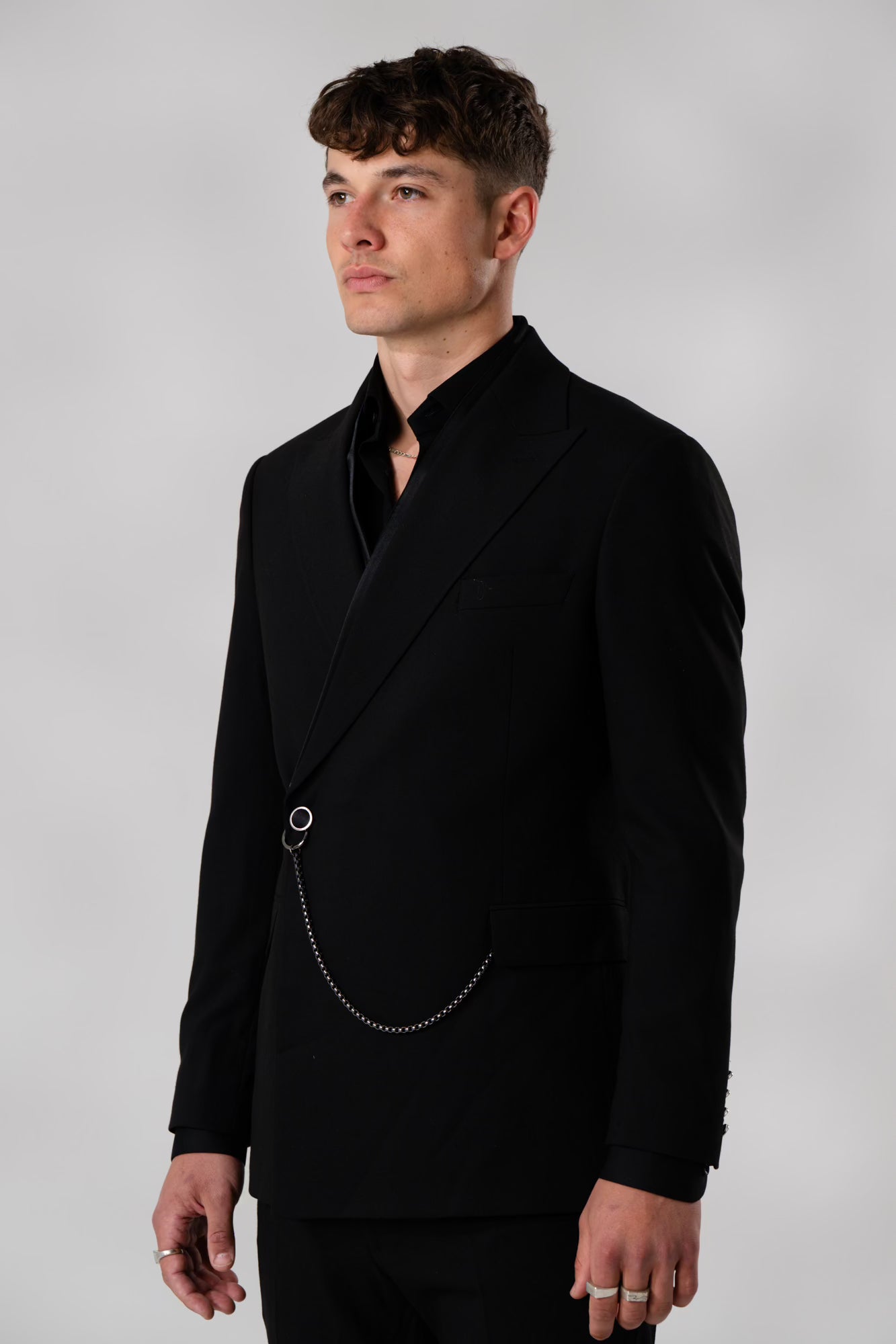 Right on the edge of black formal suiting, the Nyx has its own twist on double-breasted, making a statement out of fastening the jacket with clasps, clips and studs instead of traditional buttons. Signature Dyonsu wide peak lapel, flap pockets and cuffed finished matching pants, compliment the subtle woven (textured) stretchy fabric.