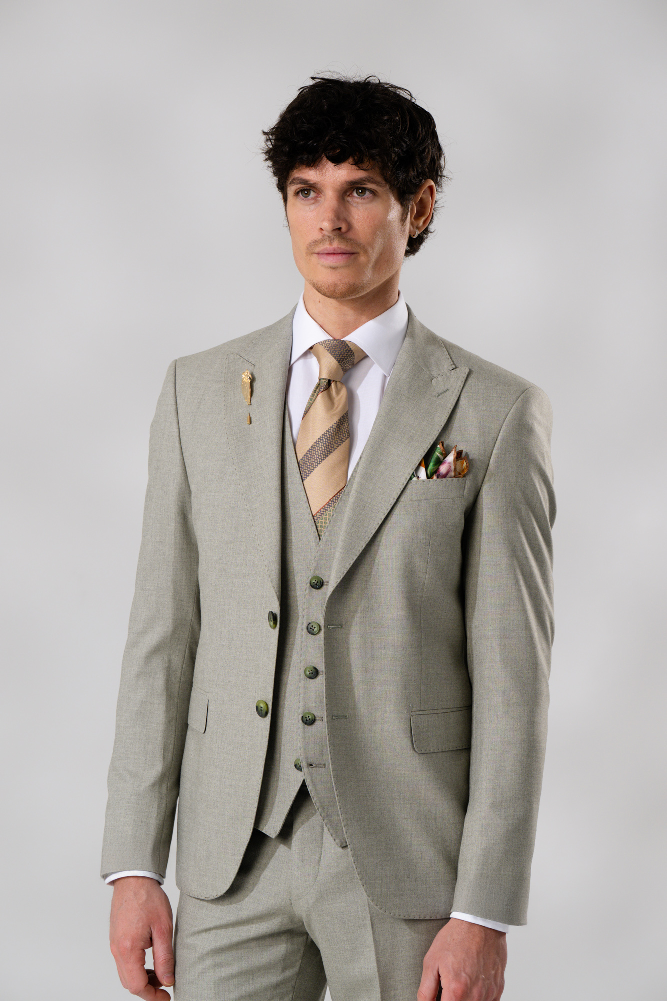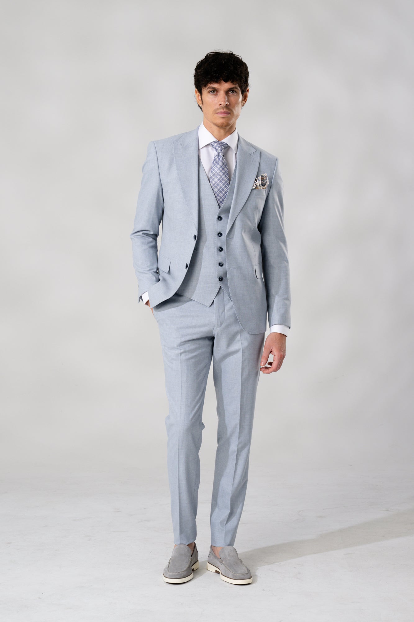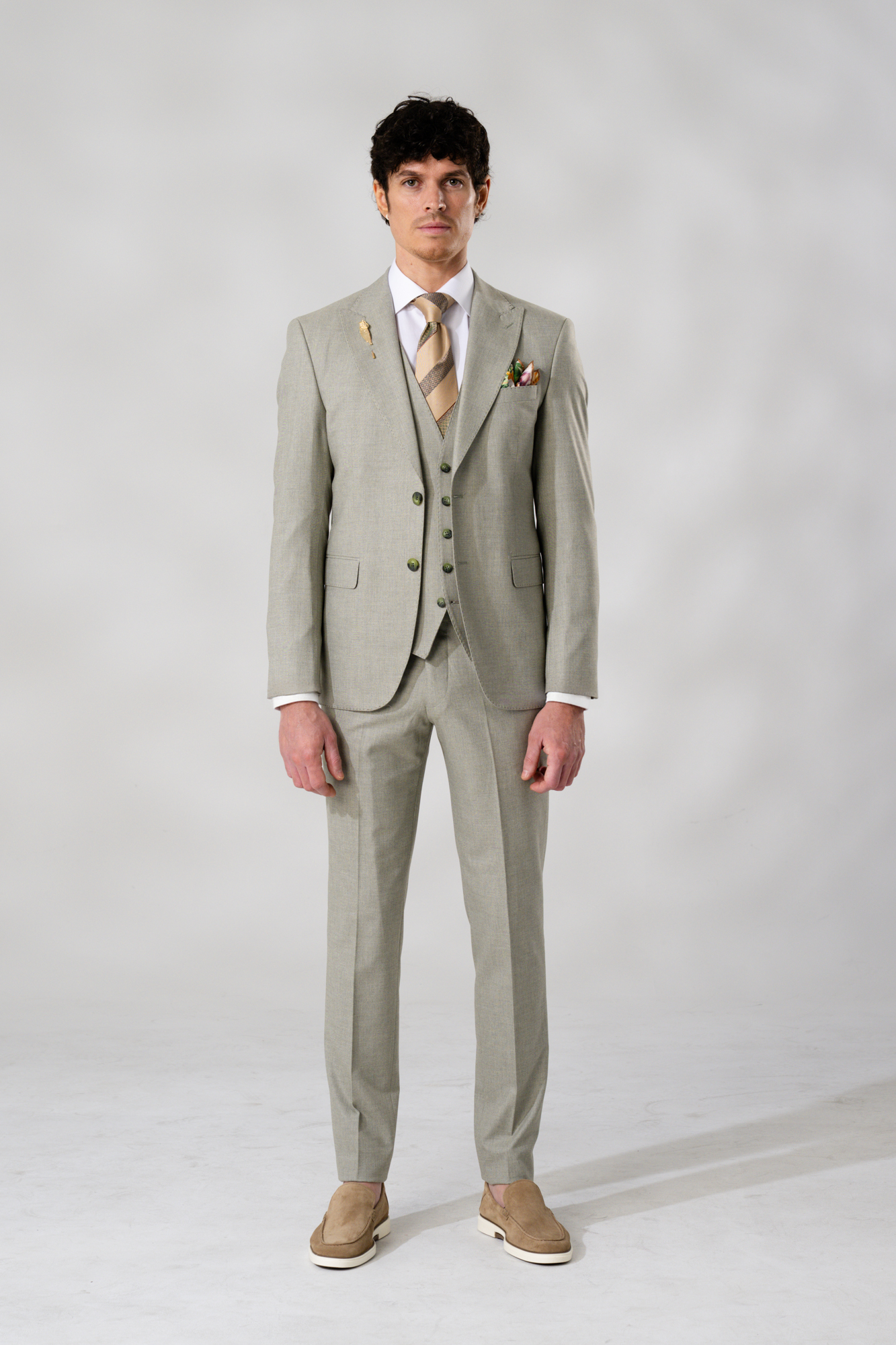 Smooth, refined, and effortlessly versatile — the Pedro 3-Piece Suit is designed for the man who wants polish without losing personality. Crafted from a soft, tonal woven fabric, it offers subtle dimension that can be styled boldly with statement accessories or kept understated with an open collar. A curved peak lapel, pick stitching, flap pockets, and complimentary tortoiseshell buttons bring sophistication, while the curved single-breasted vest adds depth and structure. A modern classic that adapts to any event with ease.