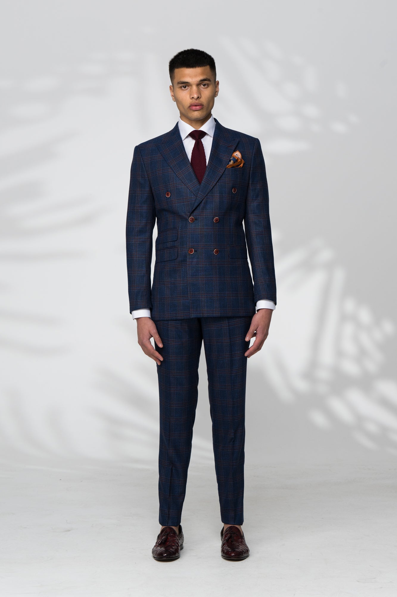 Bold, refined, and unmistakably sharp — the Sherman Suit delivers a confident statement with its rich burgundy check layered over a deep navy base. Crafted in a double-breasted silhouette, it features matching burgundy buttons, a strong peak lapel, flap pockets, and an additional ticket pocket that adds a touch of heritage tailoring. Made from 100% premium wool, this suit offers structure, breathability, and timeless sophistication — perfect for those who want colour without sacrificing elegance.