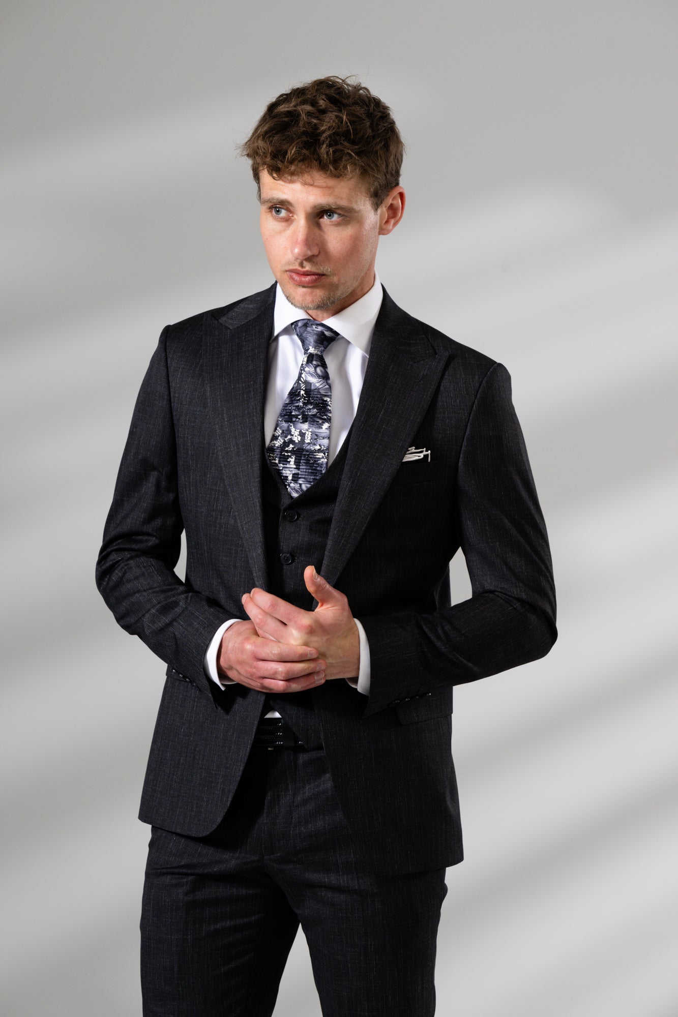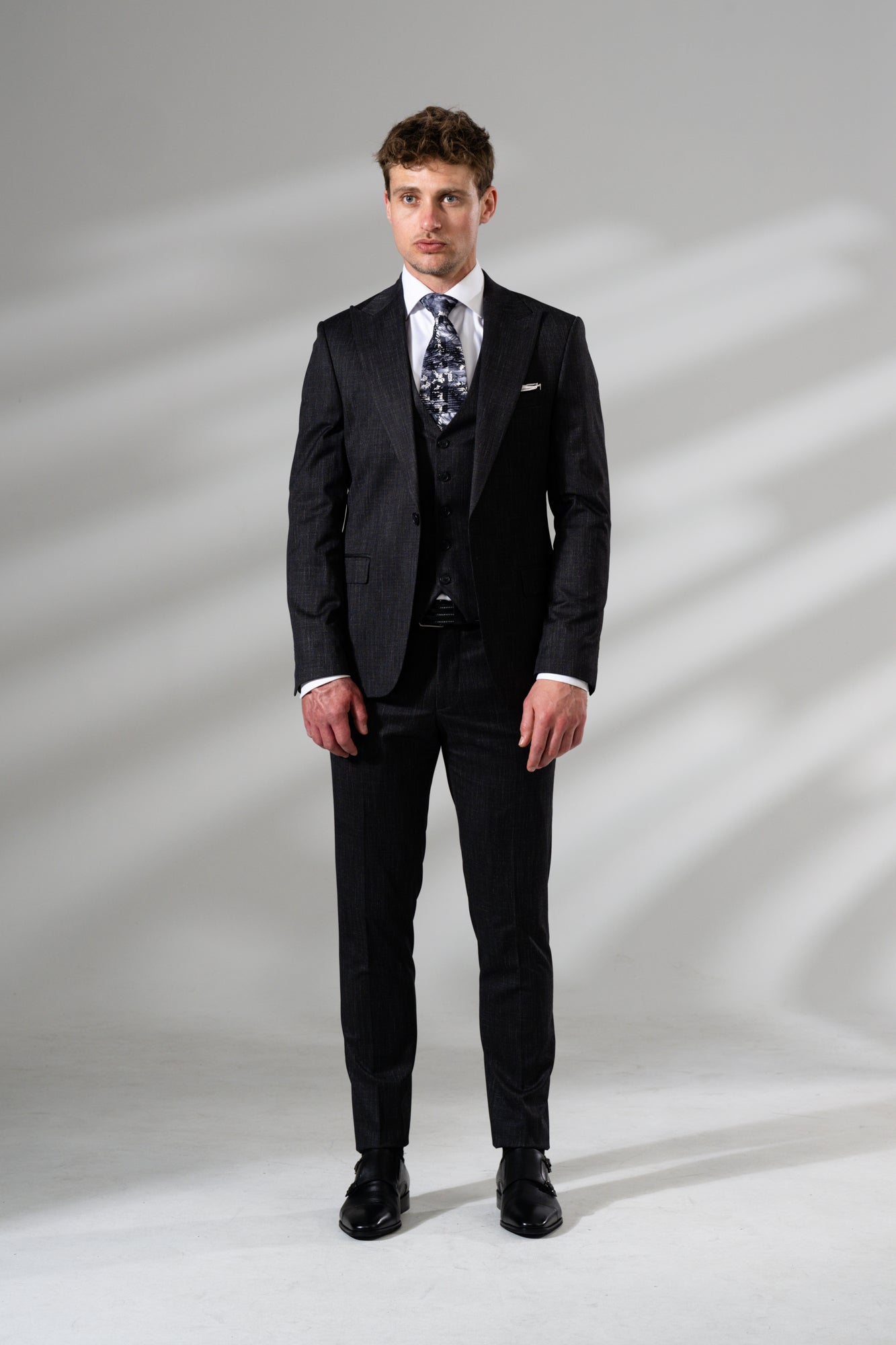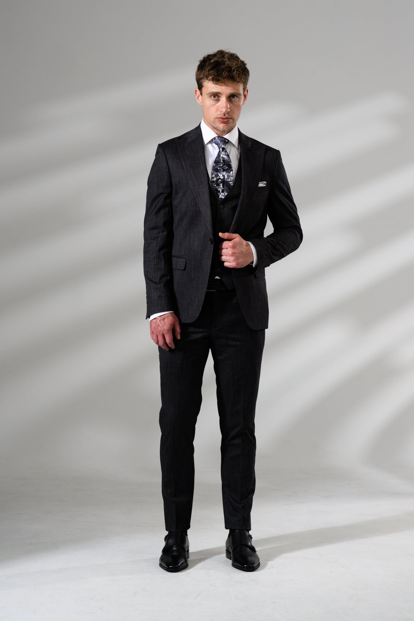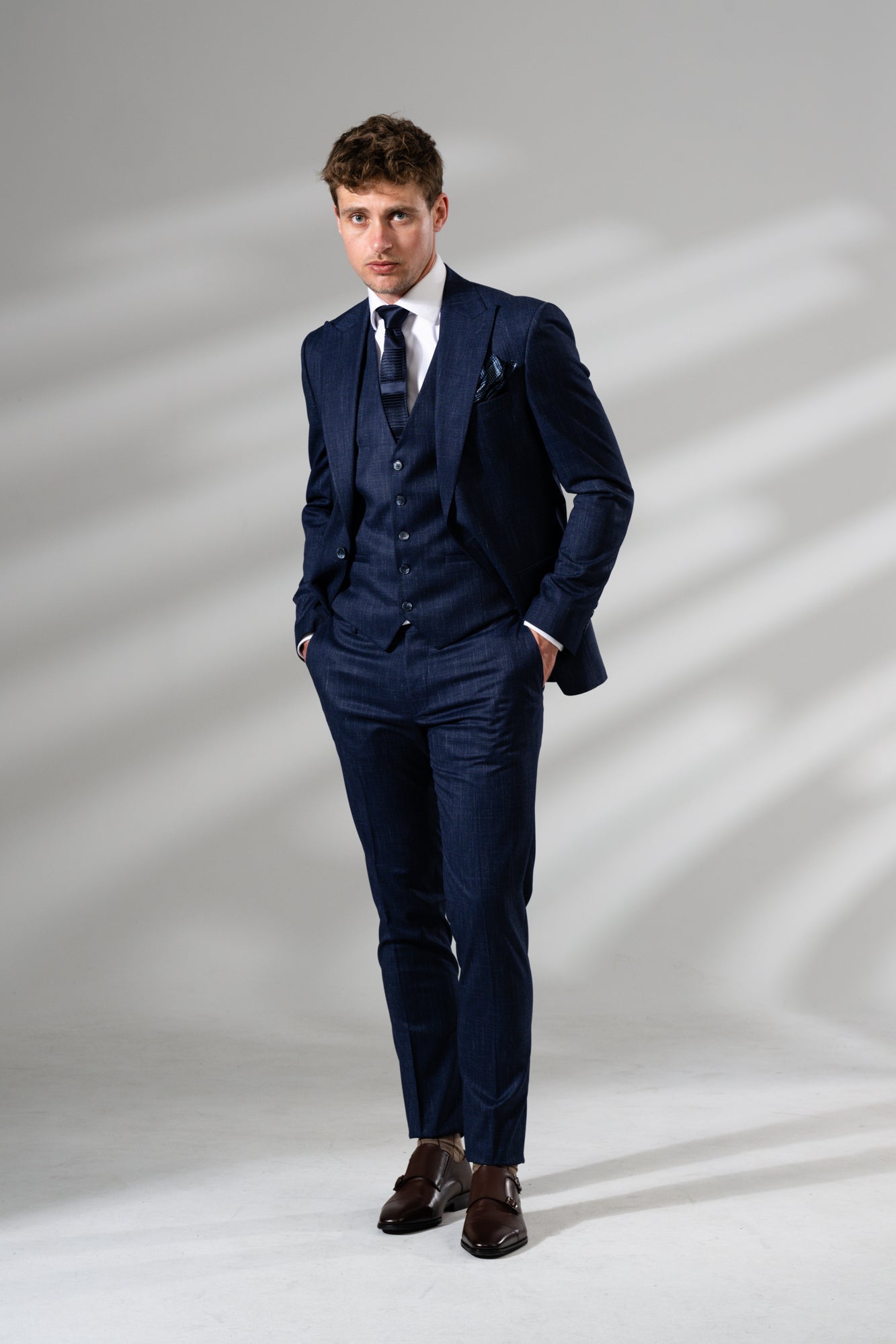 Classic tailoring meets textured personality — the Silas Suit elevates timeless suiting with a subtle flecked weave that adds depth and character without overwhelming the look. From afar, the fabric appears smooth and refined, but up close, the lighter fleck brings dimension and intrigue. Designed with a sharp peak lapel, flap pockets, and a single-button jacket, the ensemble is completed by a matching single-breasted vest and coordinated trousers for a clean, cohesive finish. A modern essential with understated flair.