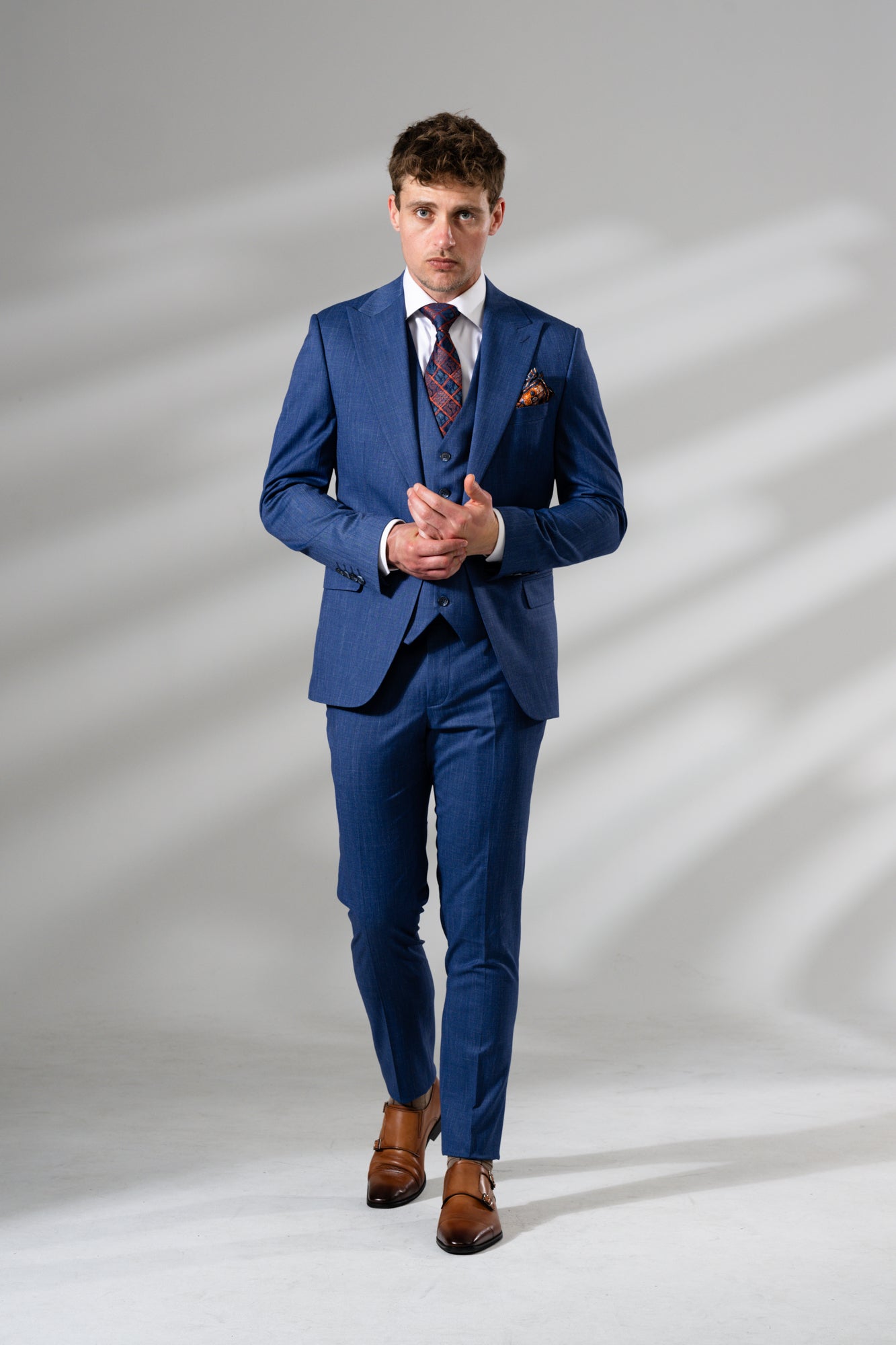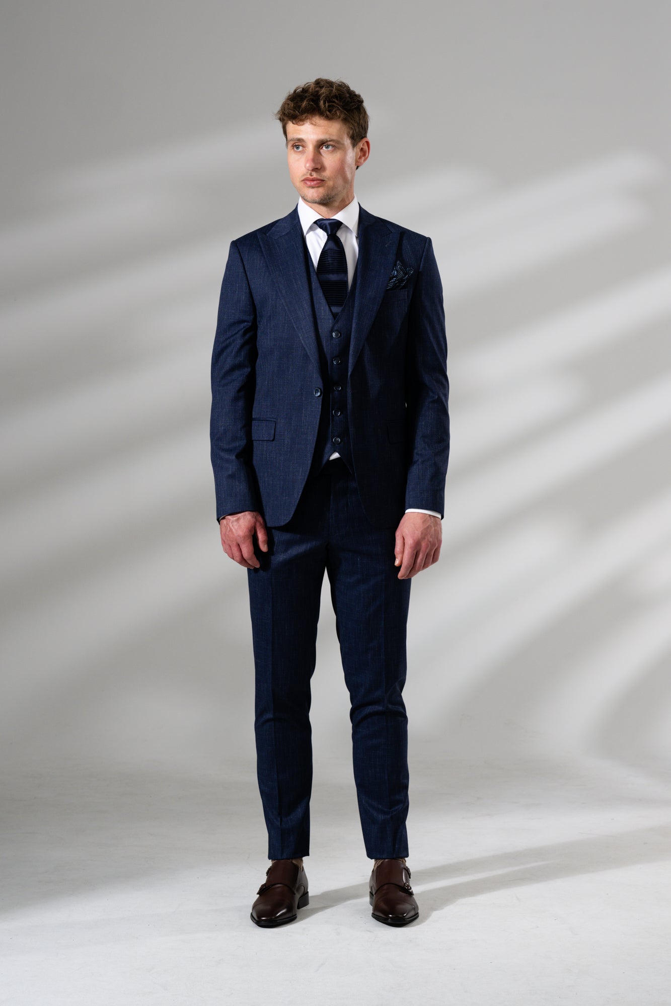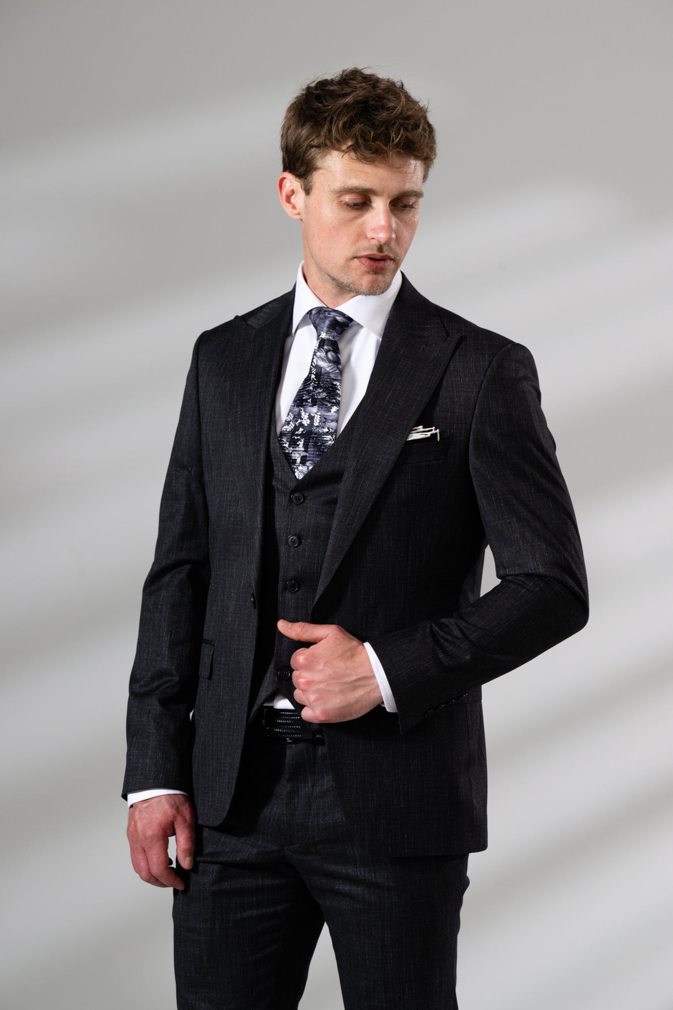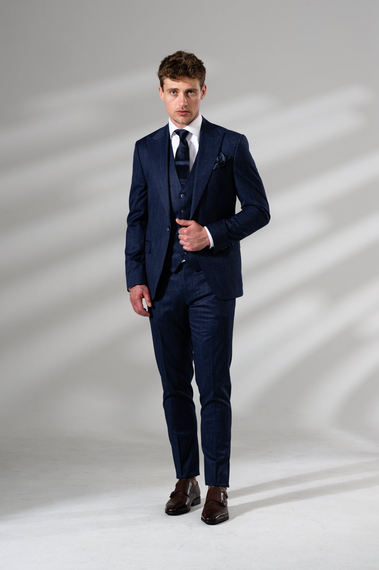 Classic tailoring meets textured personality — the Silas Suit elevates timeless suiting with a subtle flecked weave that adds depth and character without overwhelming the look. From afar, the fabric appears smooth and refined, but up close, the lighter fleck brings dimension and intrigue. Designed with a sharp peak lapel, flap pockets, and a single-button jacket, the ensemble is completed by a matching single-breasted vest and coordinated trousers for a clean, cohesive finish. A modern essential with understated flair.