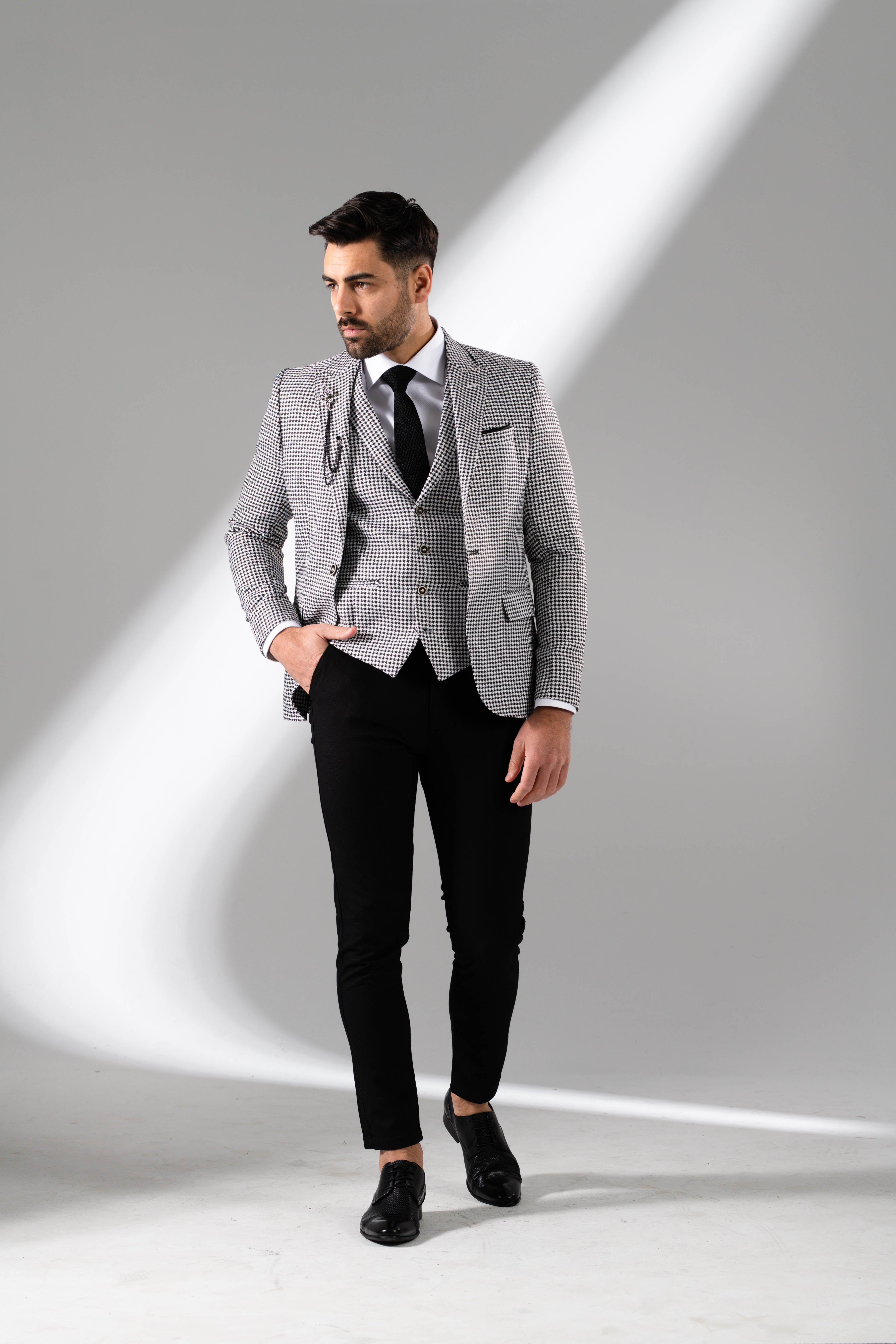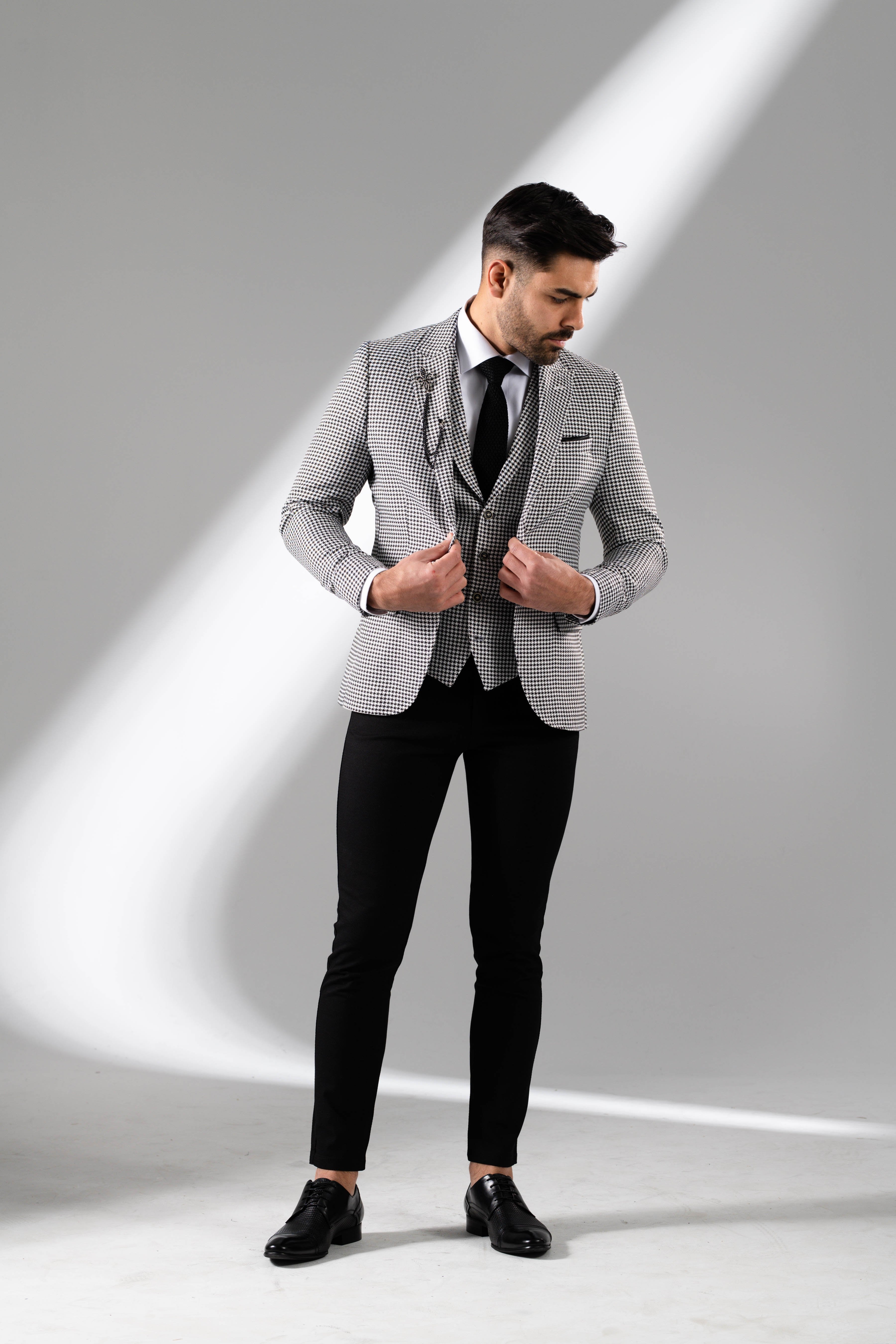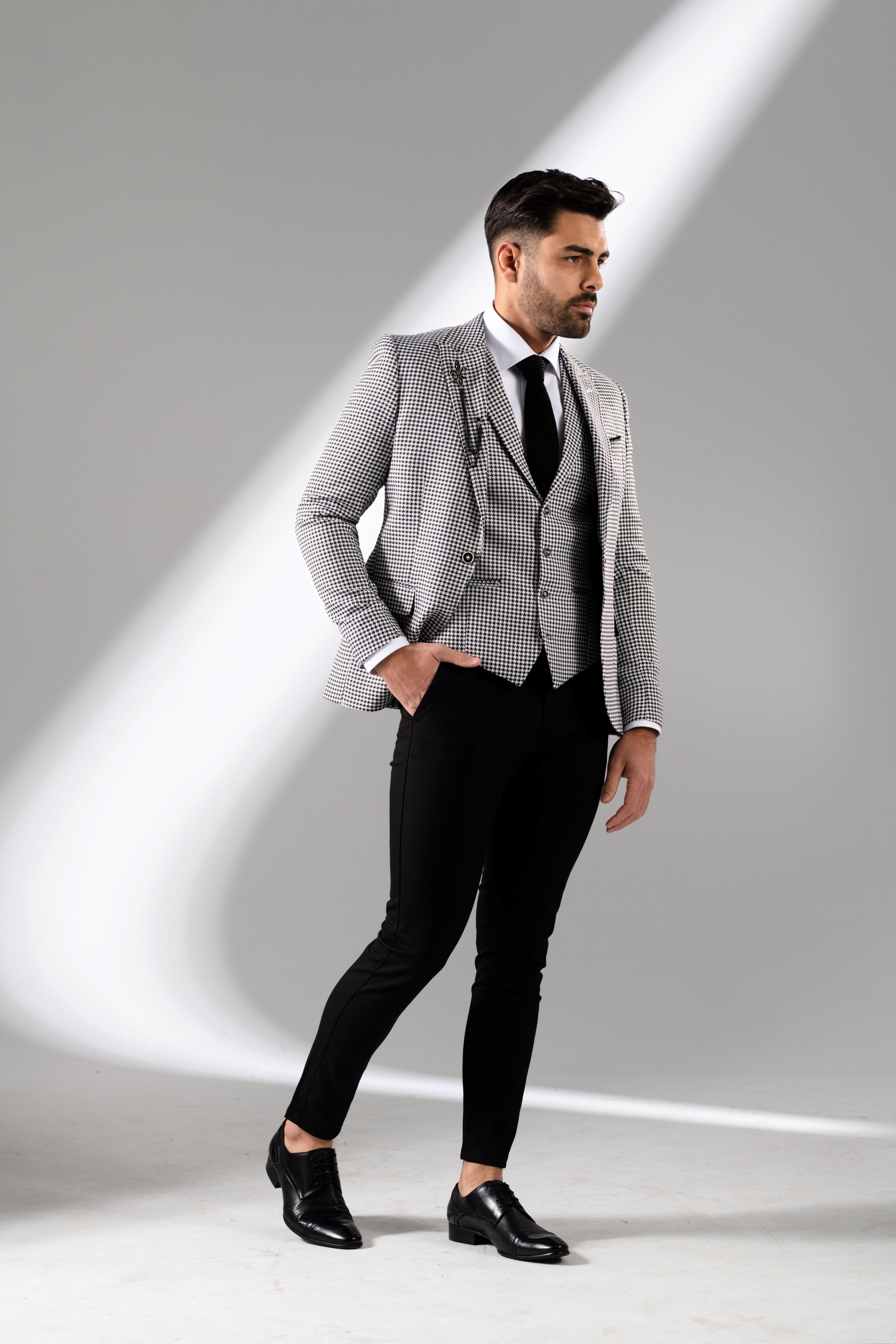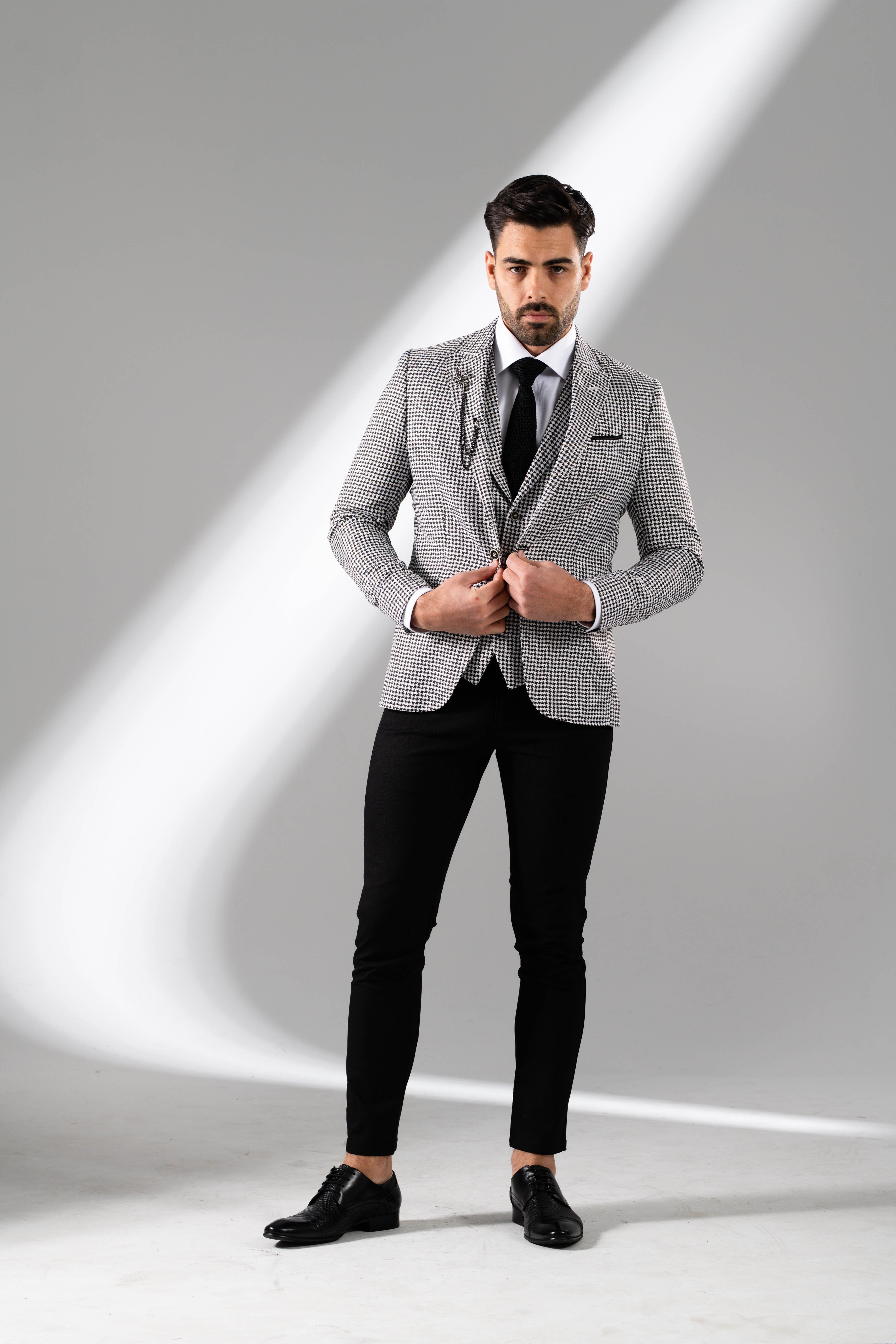 A modern revival of a Dyonsu favourite — The Hound 2.0 returns by popular demand for Spring/Summer 2024. This single-breasted houndstooth jacket offers sharp, timeless style with a peak lapel, flap pockets that can be tucked into hidden slits, and a clean, structured silhouette. Pair it with the matching houndstooth vest for a complete statement look. The vest features its own step lapel, adding height and presence when worn open or fully buttoned. Lightweight, versatile, and built to elevate both tailored and smart-casual fits.