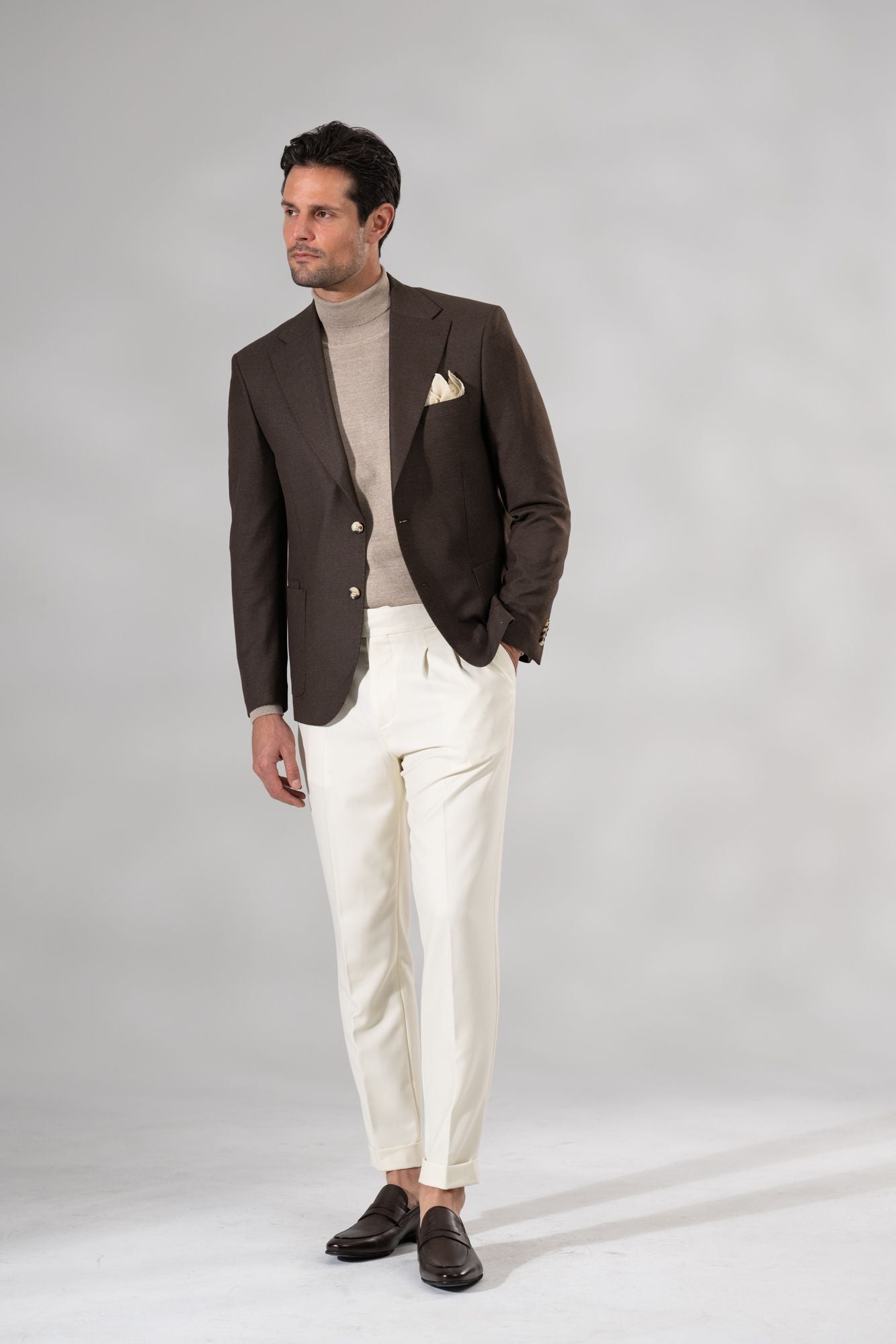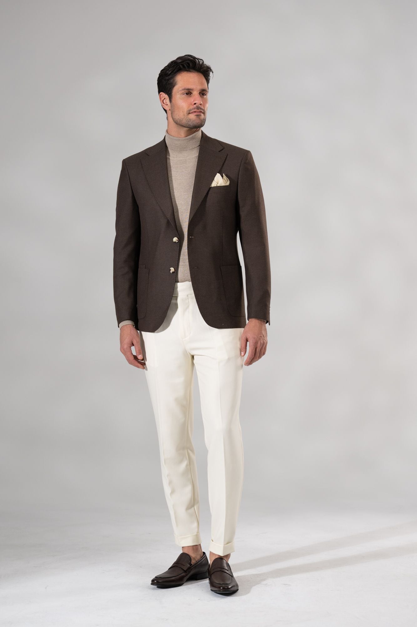 - Single-breasted silhouette with step lapel