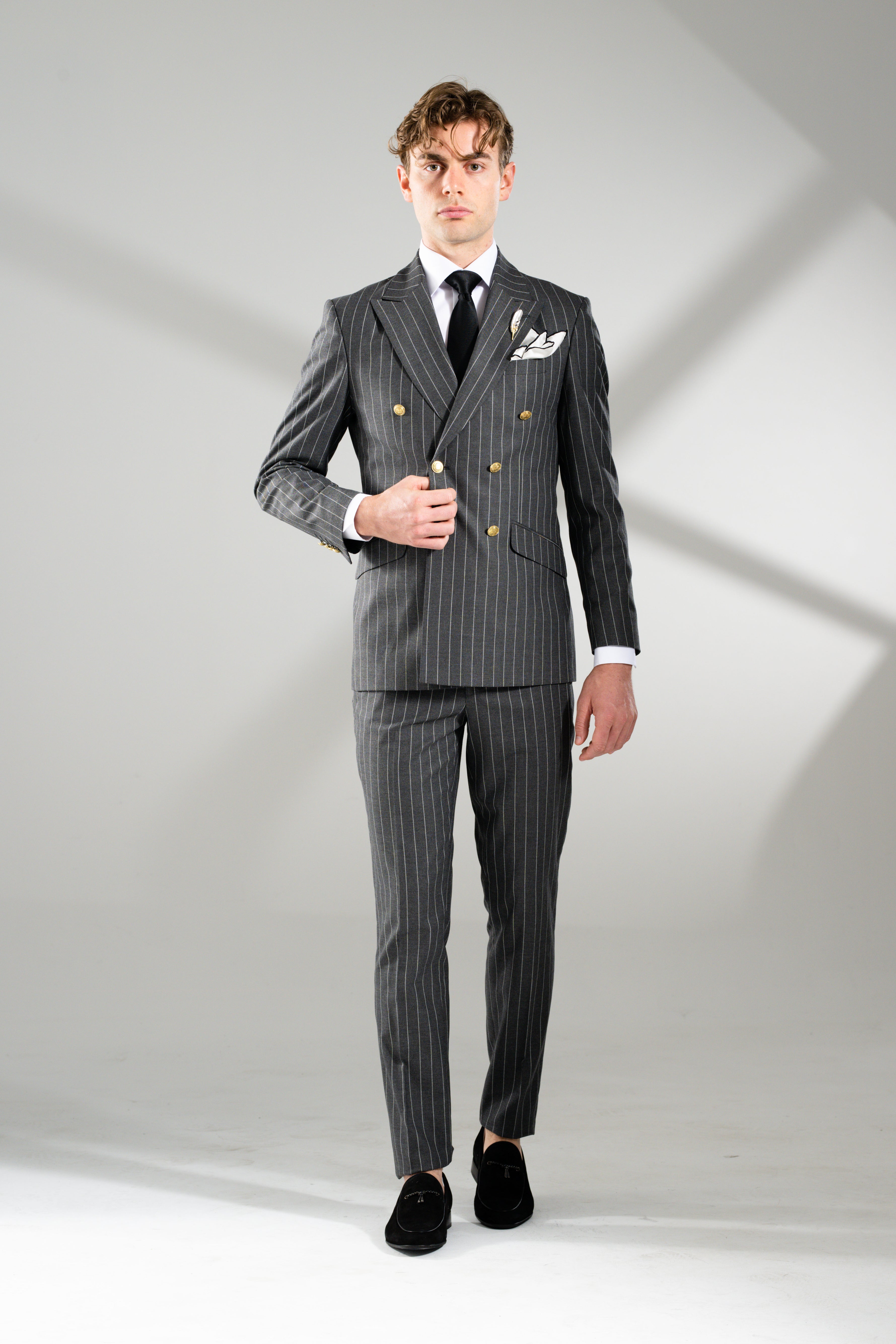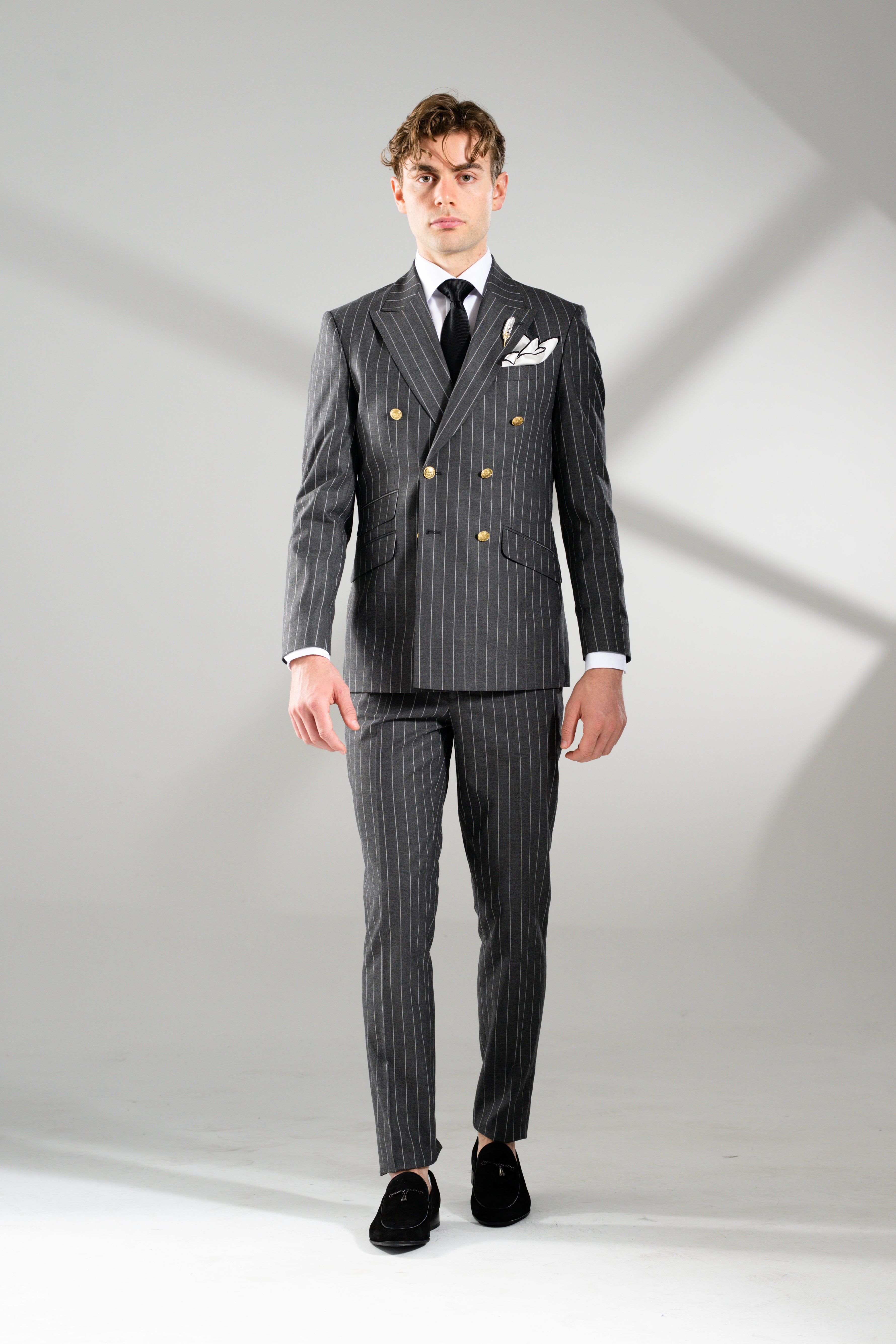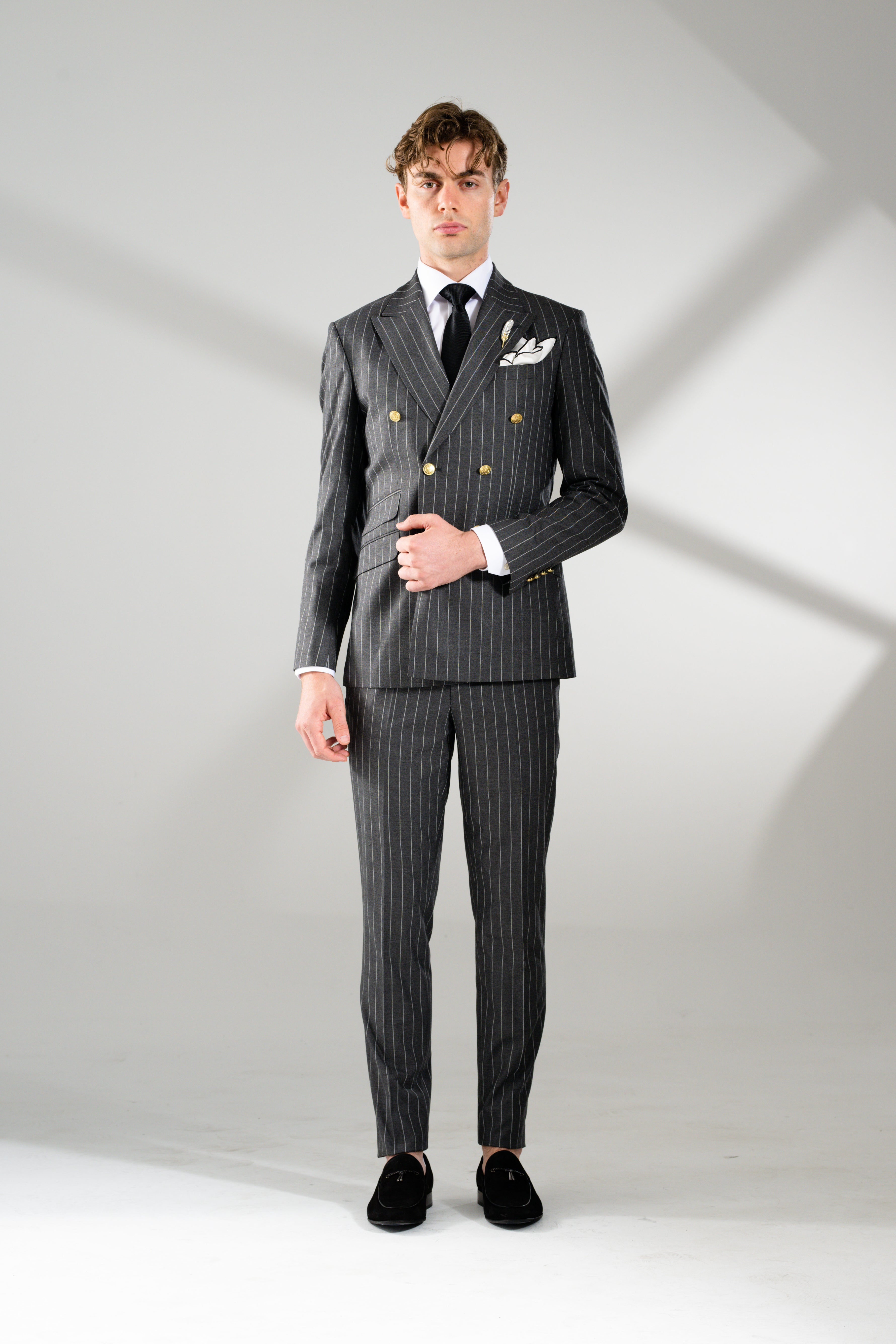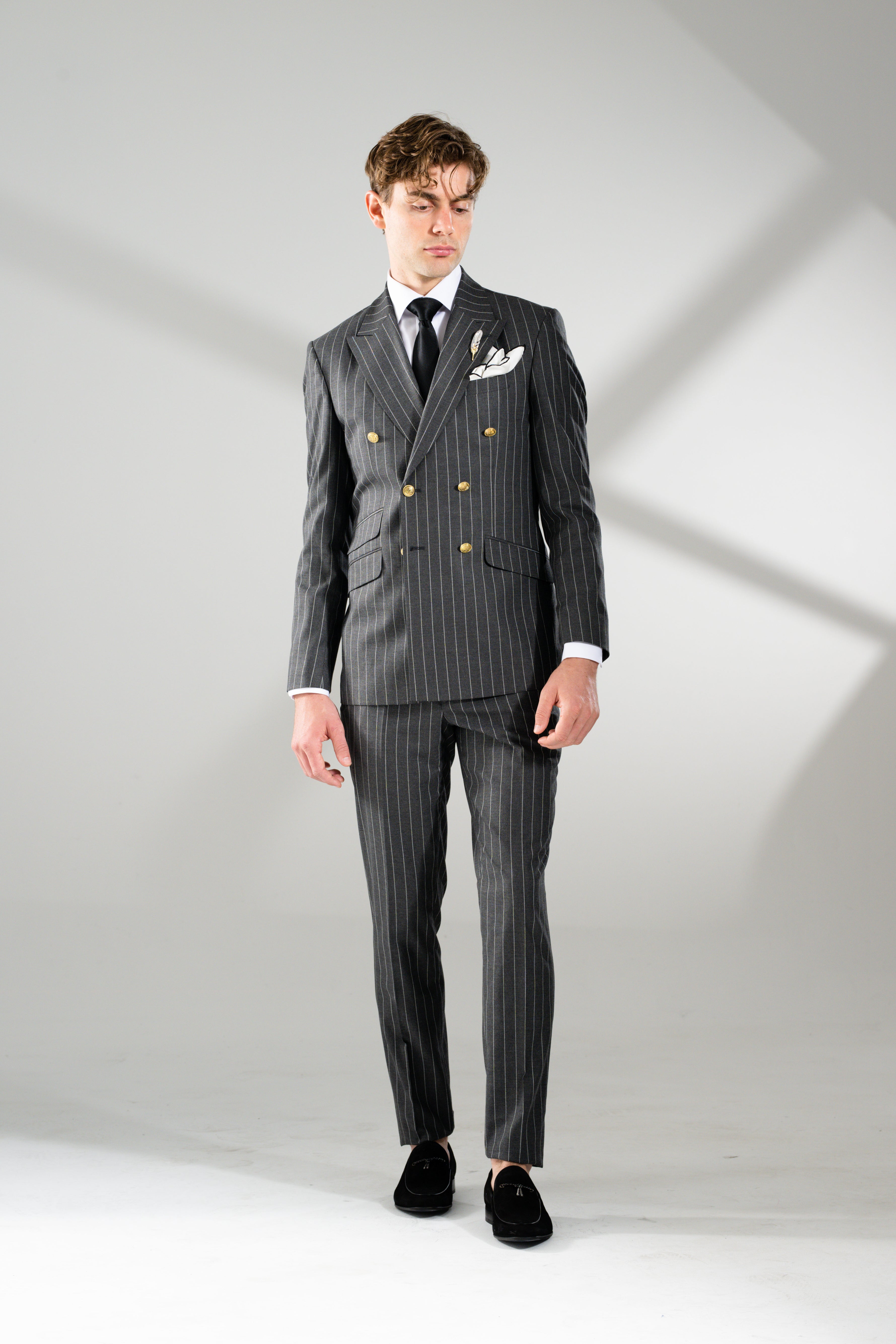 A sharper, bolder take on the original Toby. This double-breasted suit features a wide peak lapel, metallic buttons, a clean white pinstripe and a ticket pocket for added character. A modern power look with a refined finish.