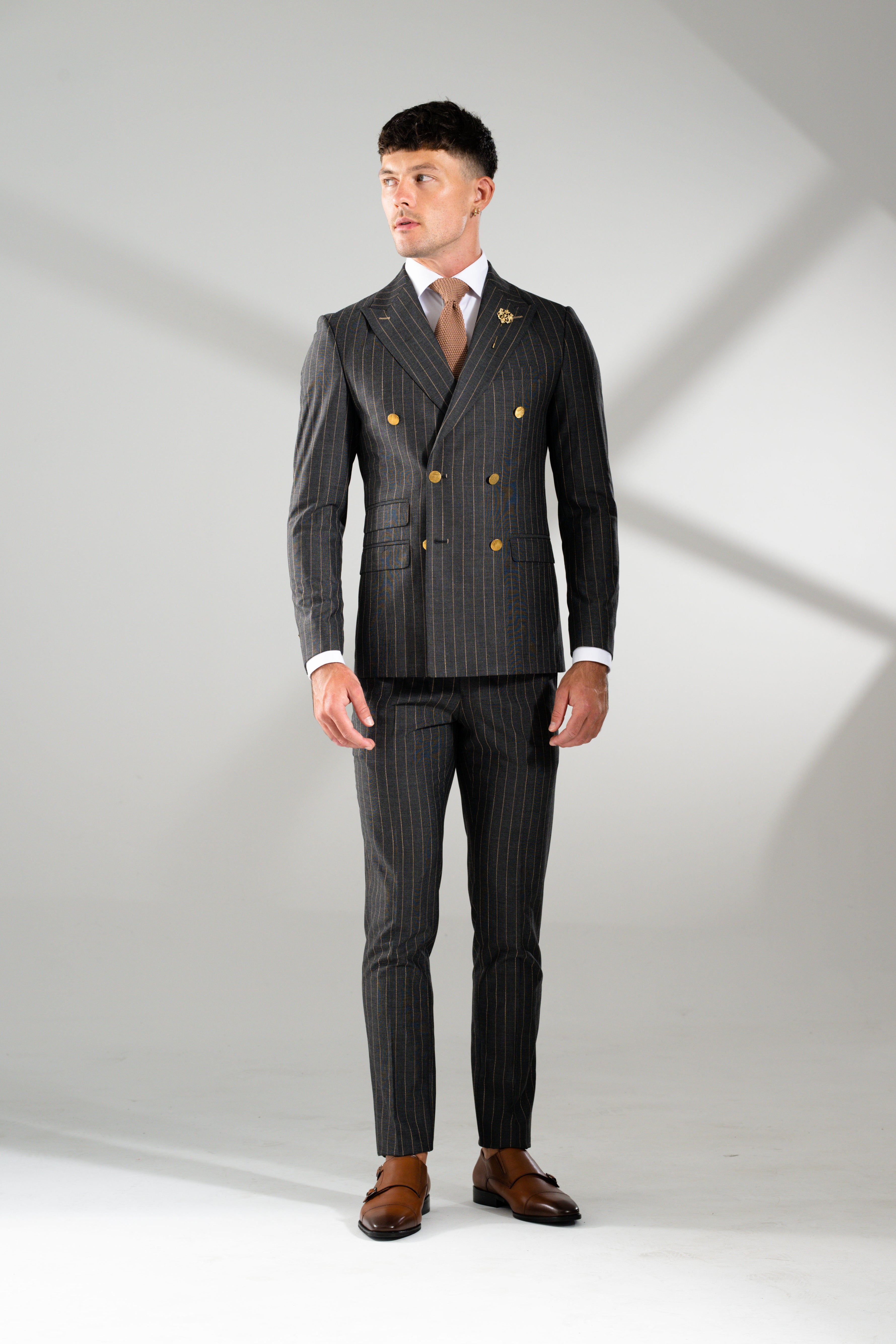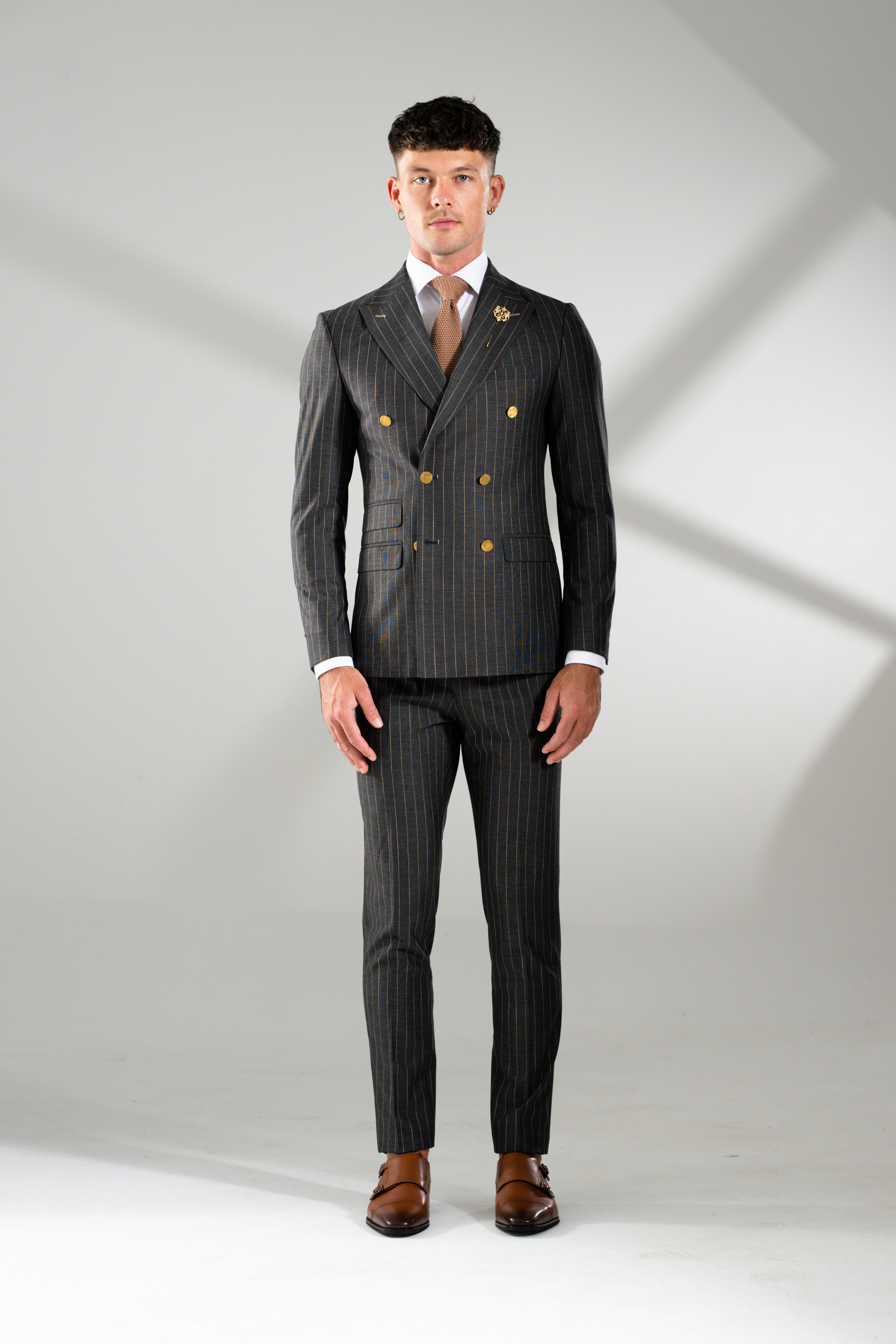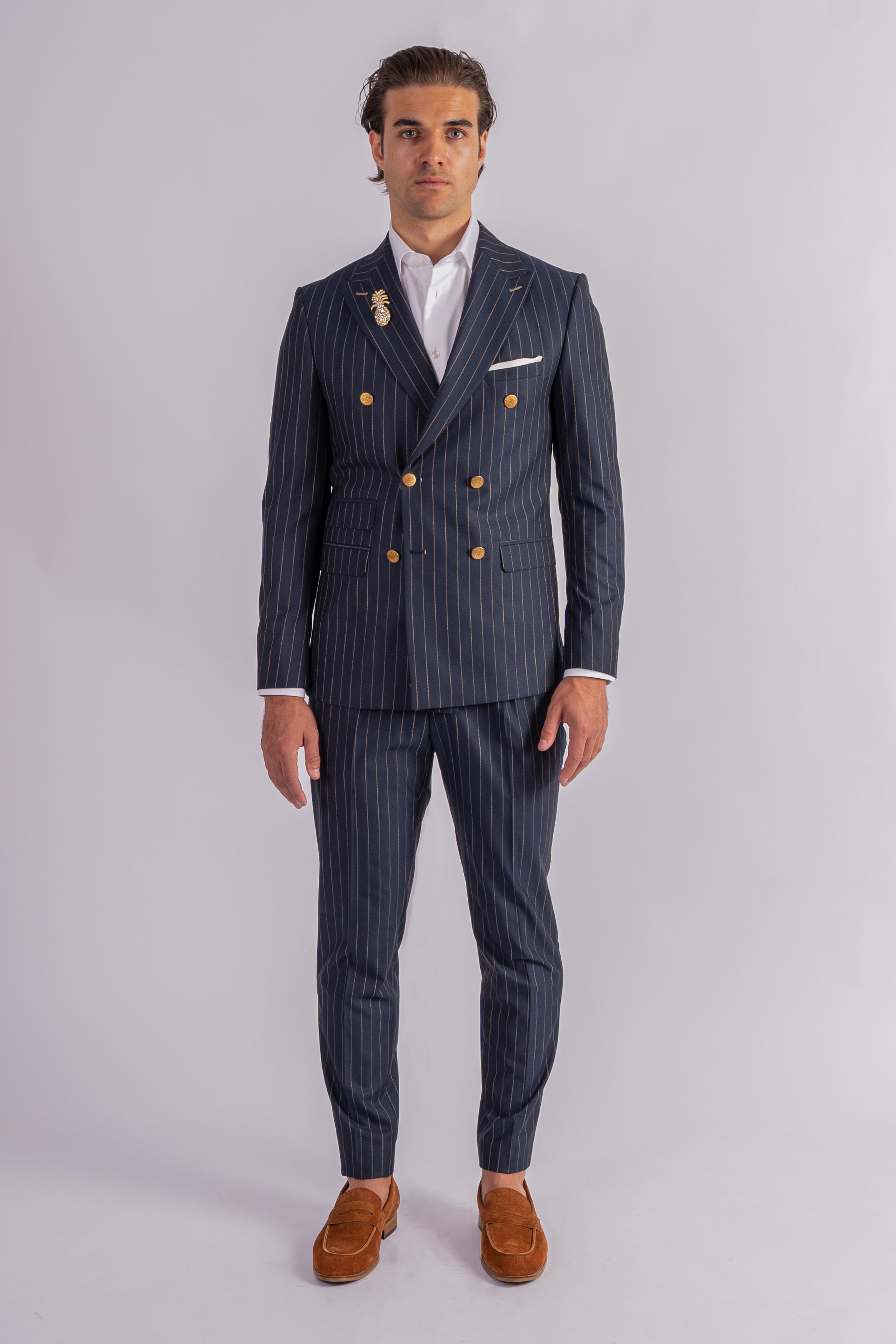 A clean and confident pinstripe suit made for summer. This double-breasted style features a wide peak lapel, metallic buttons and a ticket pocket, with a soft slightly stretchy fabric that keeps you comfortable all day.