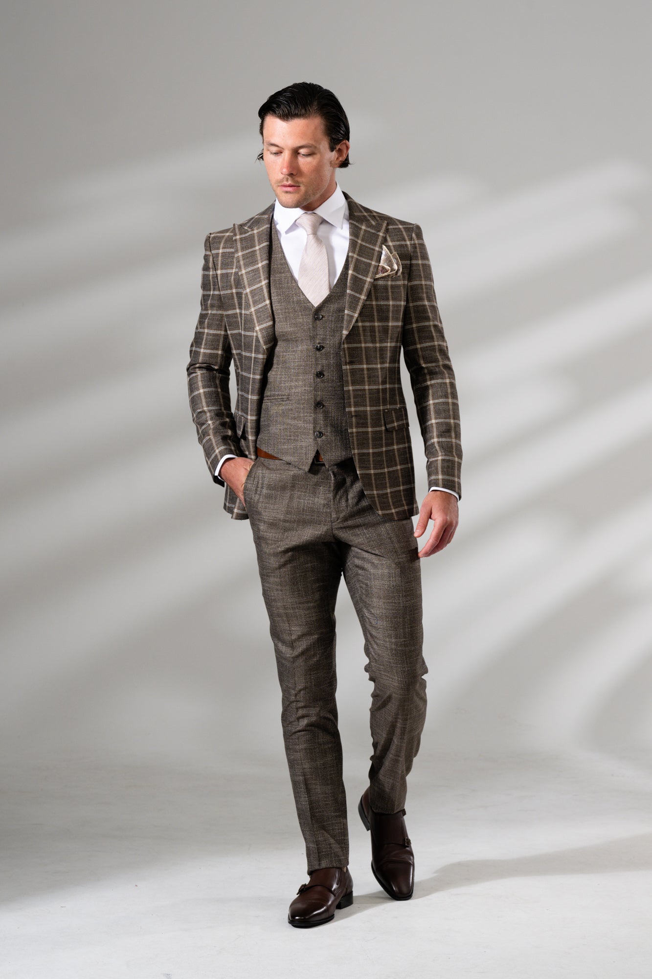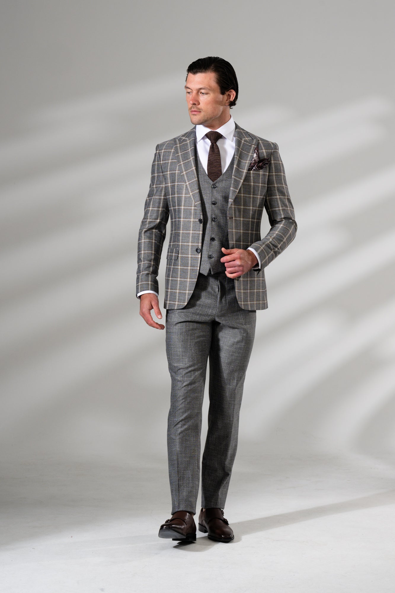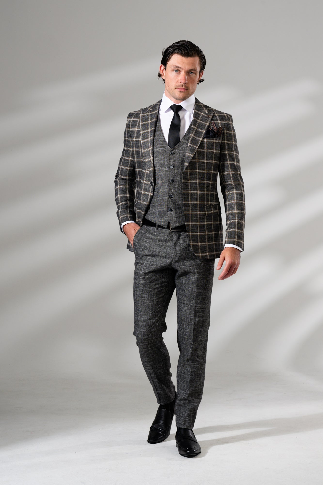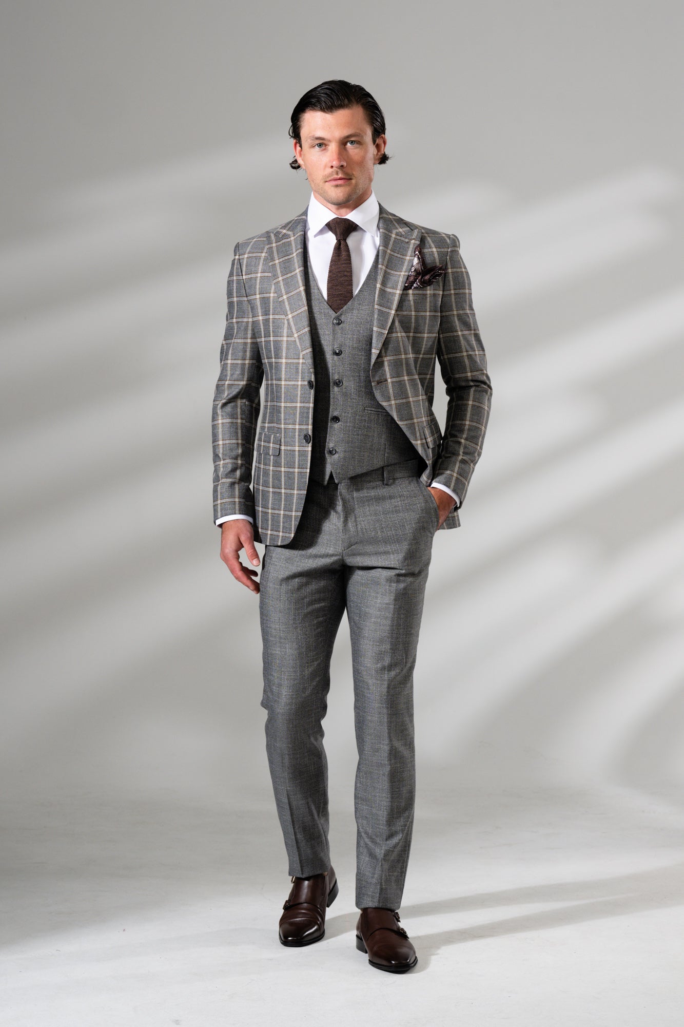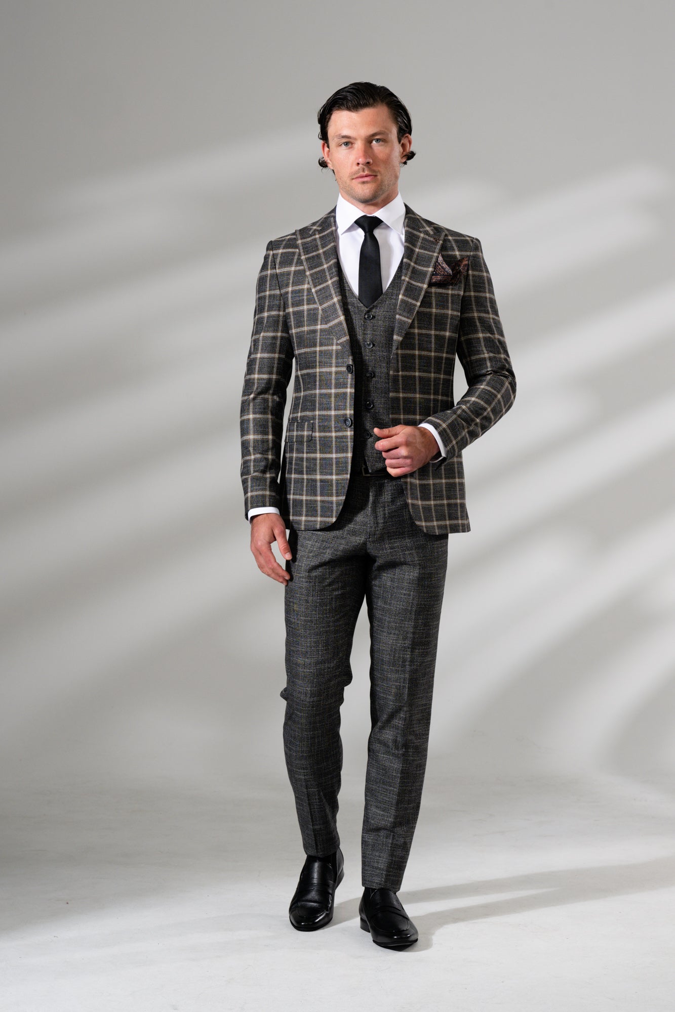 A standout check jacket paired with a sharkskin vest and pant. The Vinni blends versatility and formality with a peak lapel, flap pockets and a W cut vest that elevates the full 3 piece look.
