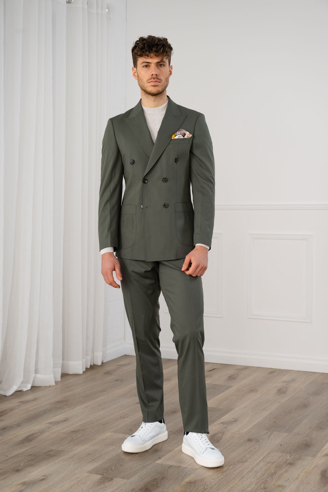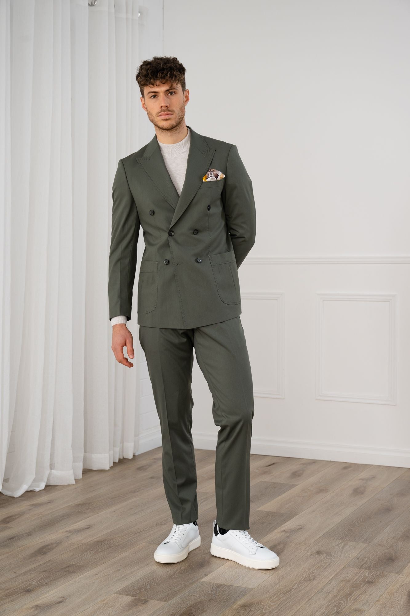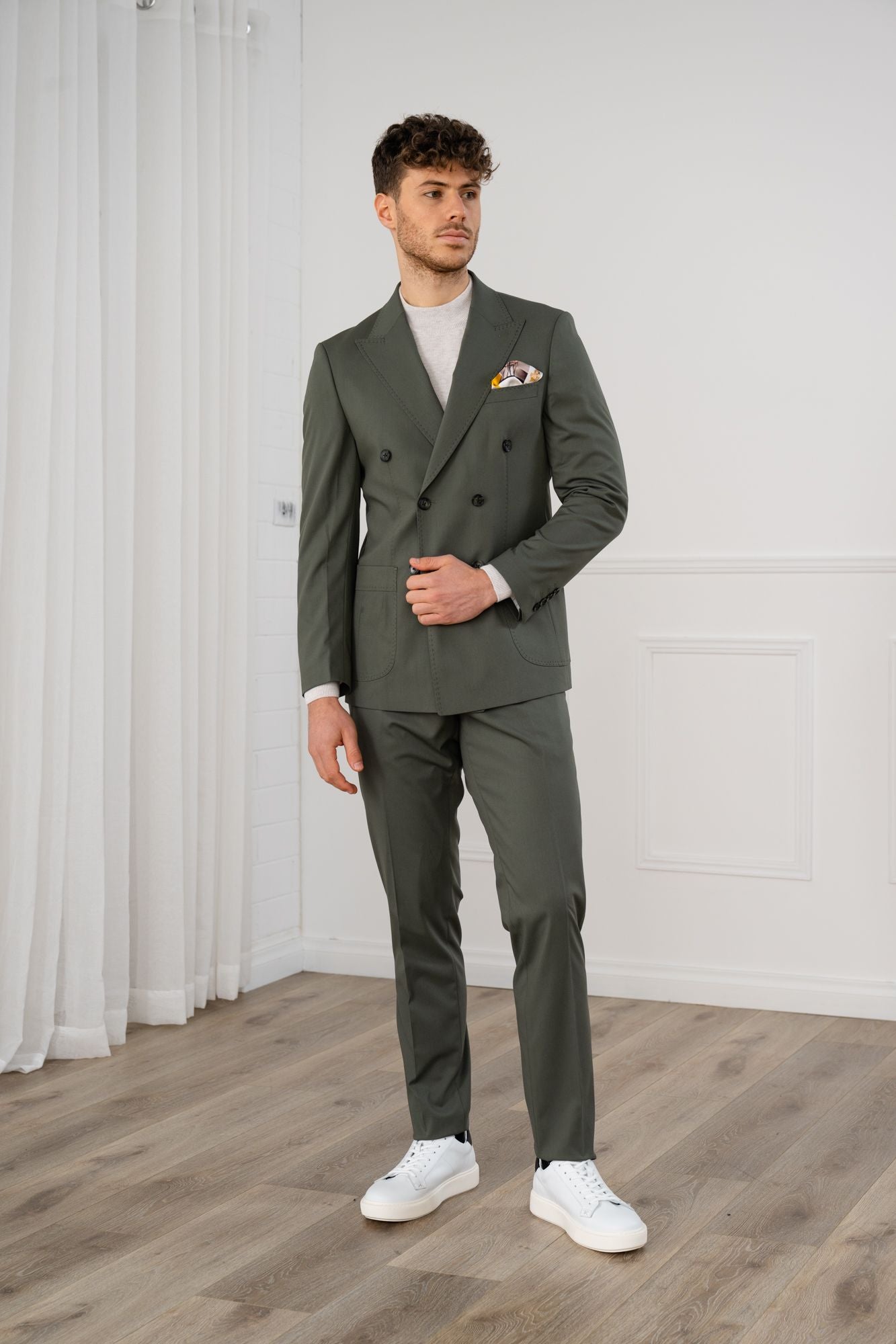 A relaxed, sporty twist on classic tailoring. The Zion suit blends stretch comfort with a double breasted silhouette, peak lapel, pick stitch detailing and statement buttons. Patch pockets add a safari inspired feel, while the trousers work perfectly on their own for easy everyday wear.