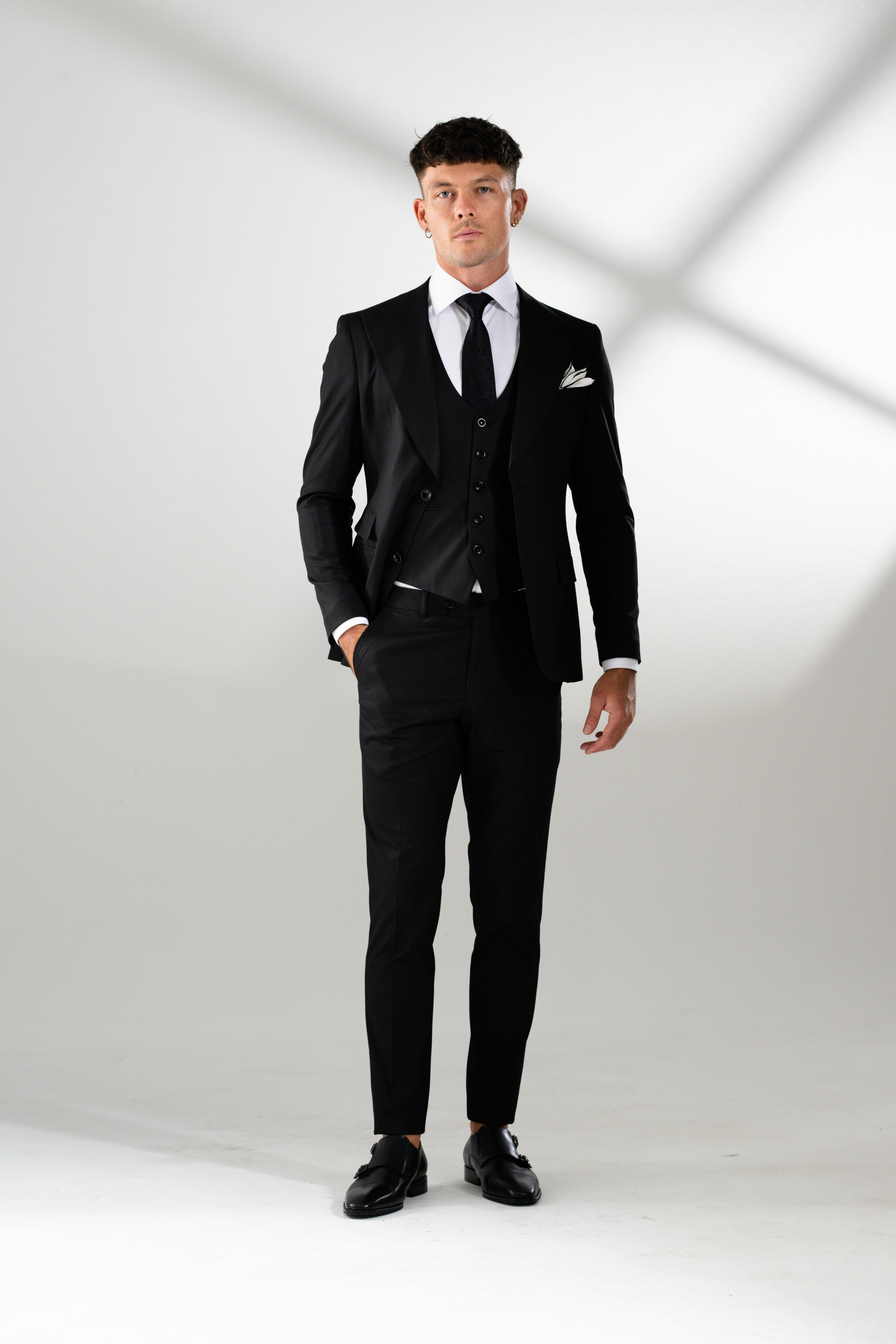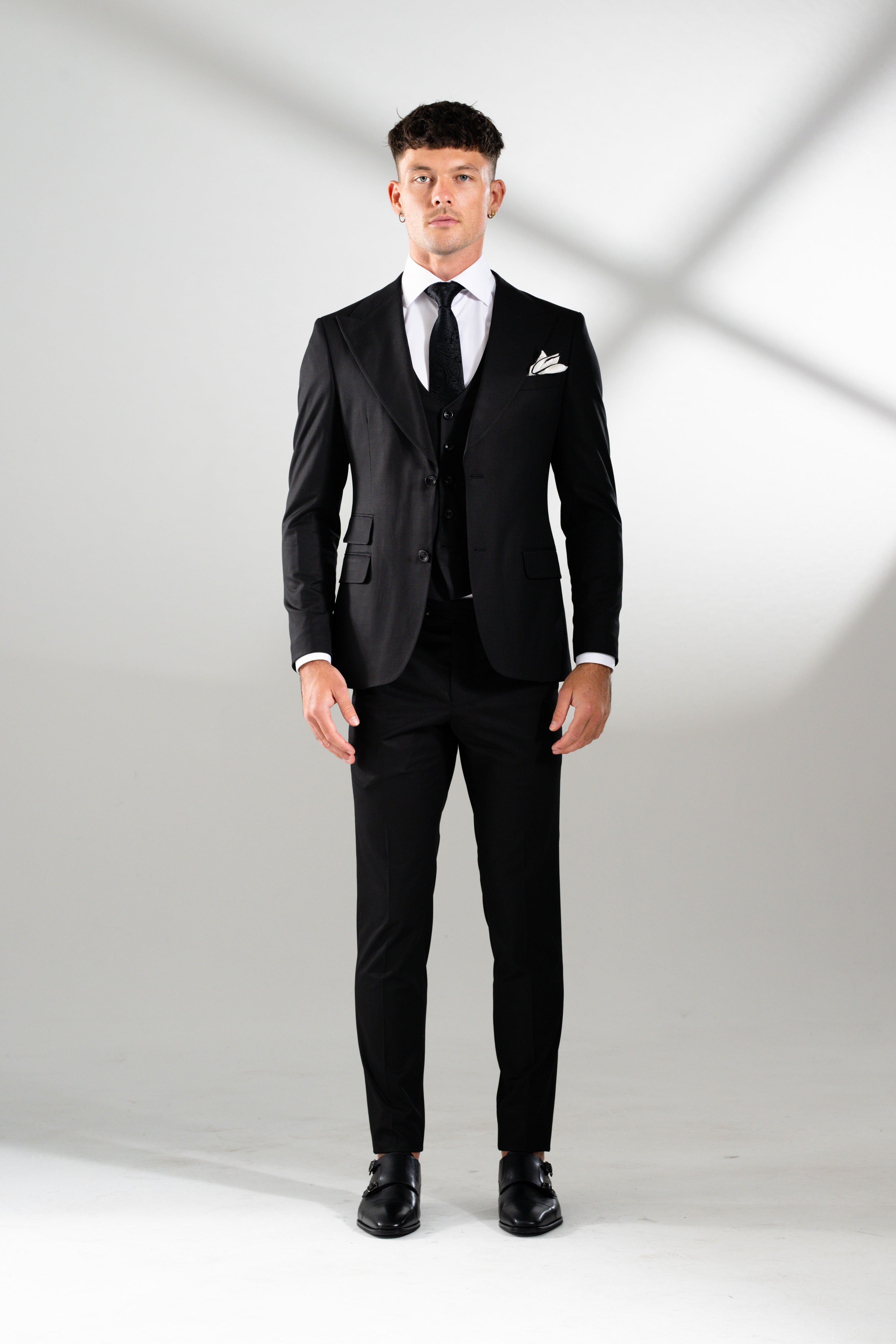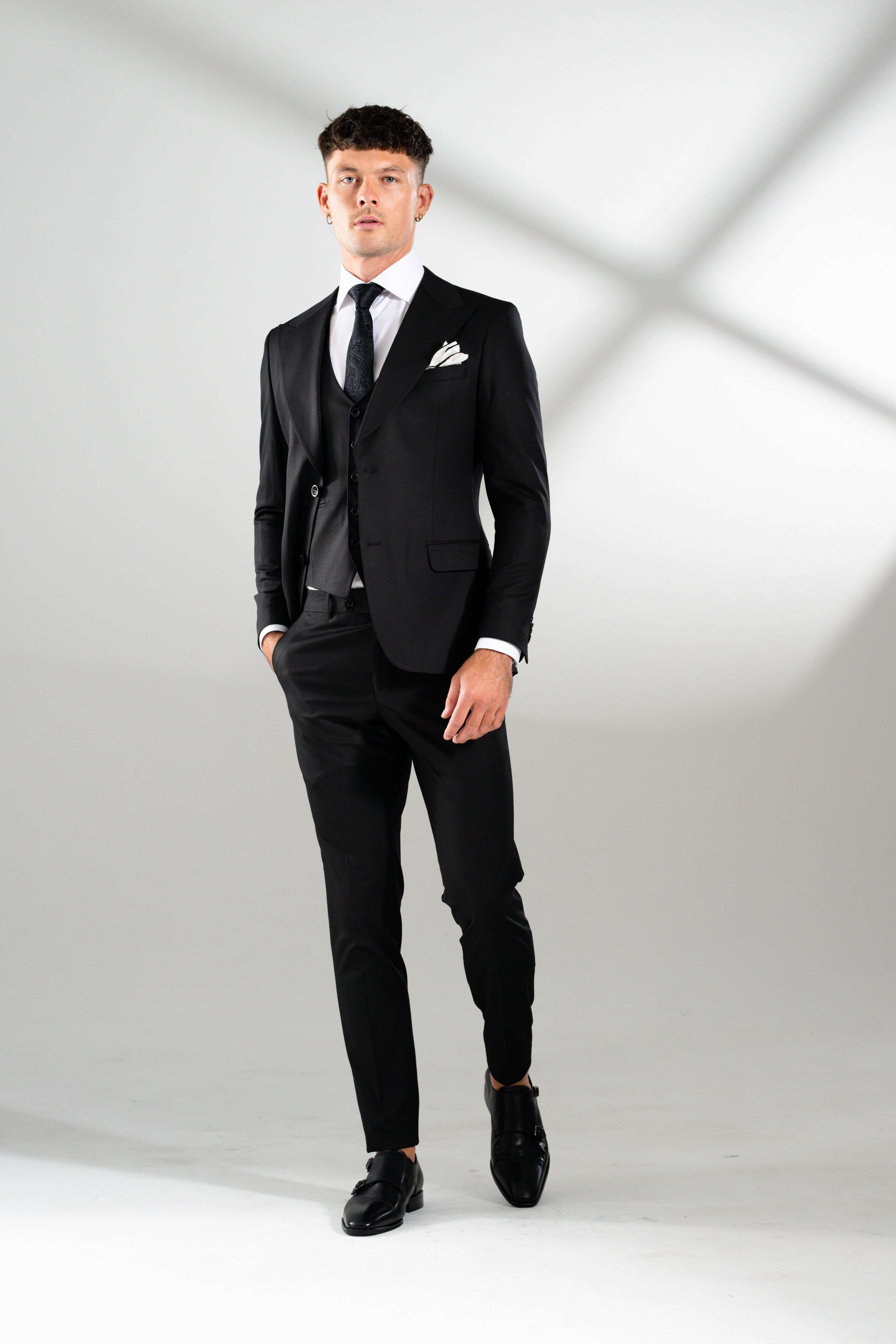 Italian inspired tailoring in a clean black finish. The Zoro suit features a wide peak lapel, ticket flap pocket, single breasted vest with a fabric back and matching slim fit trousers. A versatile choice for weddings, formal events and elevated evening wear.